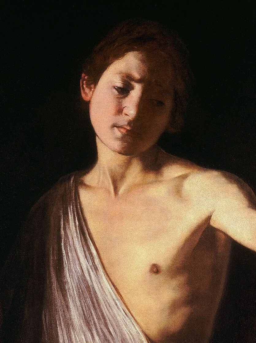 Caravaggio’s David is perturbed, depicted with an expression mingling sadness and compassion. Many scholars agree that the decision to depict him as pensive and resigned rather than jubilant creates an unusual psychological bond between him and Goliath. This bond is further complicated by the fact that Caravaggio has depicted himself as recently beheaded Goliath, still dripping blood, while the model for David is “il suo Caravaggino” (“his own little Caravaggio”).