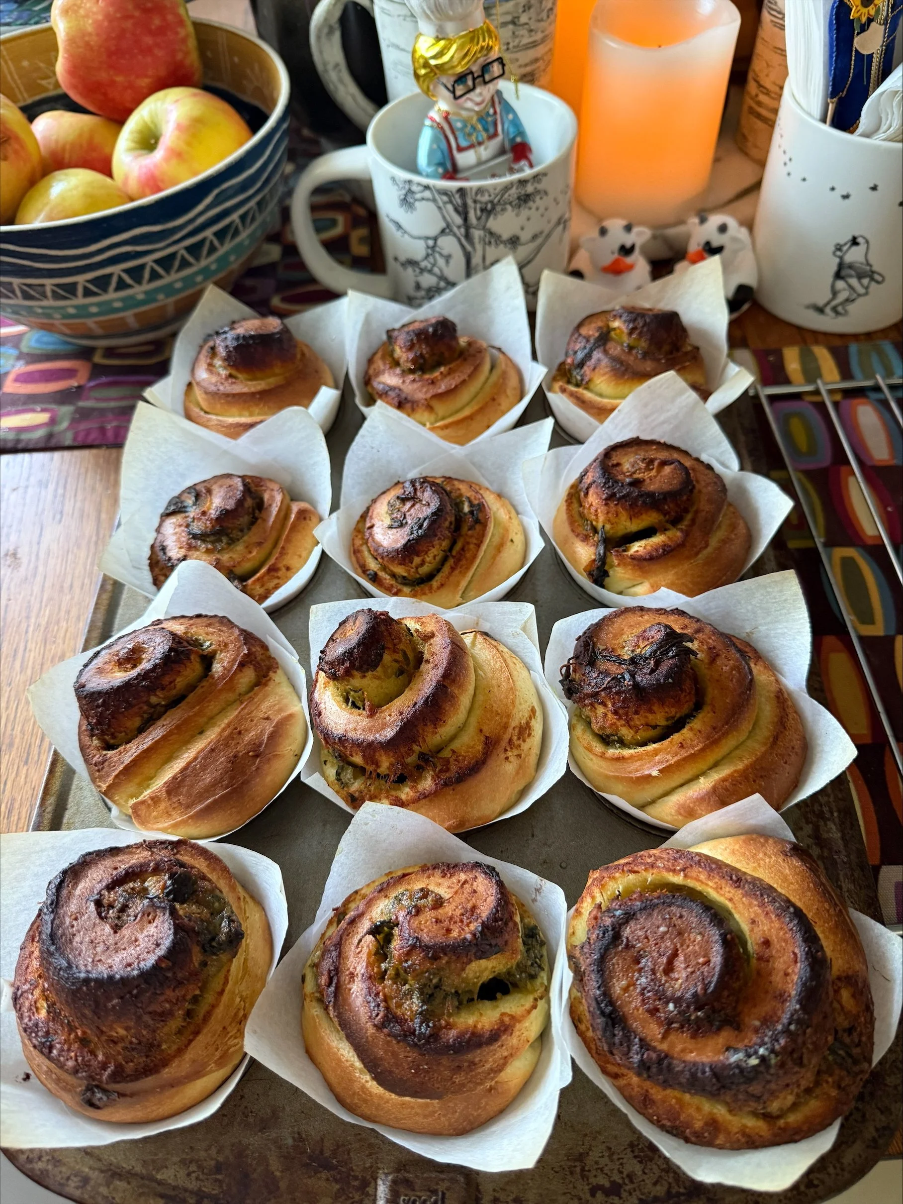 5) Roll the first half into a rectangle, roughly 12” by 16”. Spread ¾ cup of your pesto over the upper two-thirds of the dough. Roll the dough up into a tight log. Use dental floss to cut the log into twelve even pieces. Place each piece onto a parchment liner and place into the muffin pan.