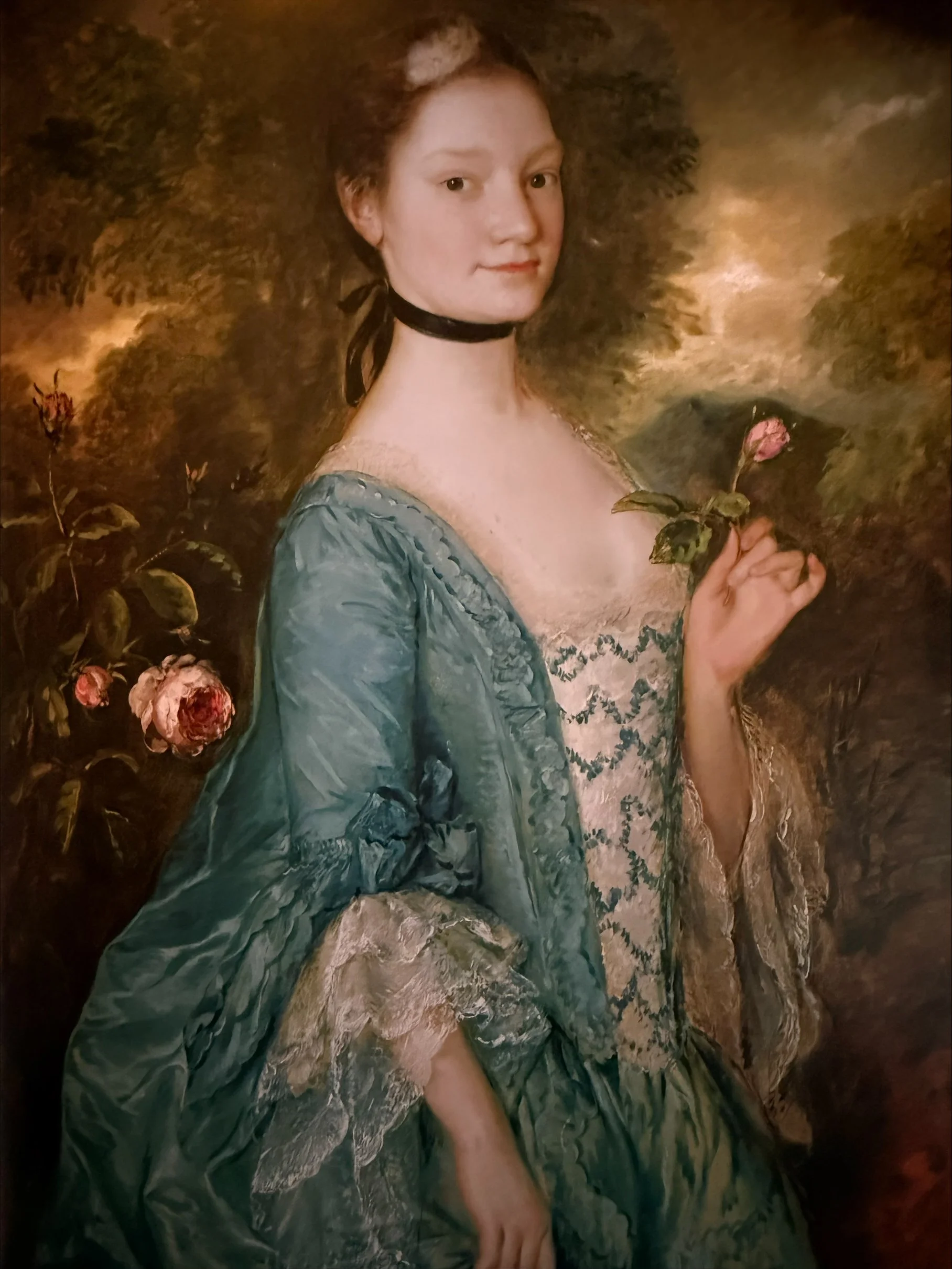 “It’s imagery,” writes Ng, “symbolizing the sitter’s blossoming youth with a rosebud in her had and a rose unfurling in the bush at left suggesting the promise of maturity, would have been suited to a portrayal of an unmarried heiress.” Sarah wed Captain William Innes in 1766, just seven years later, and then tragically died in 1770 at age thirty-three, shortly after the birth of her second daughter.