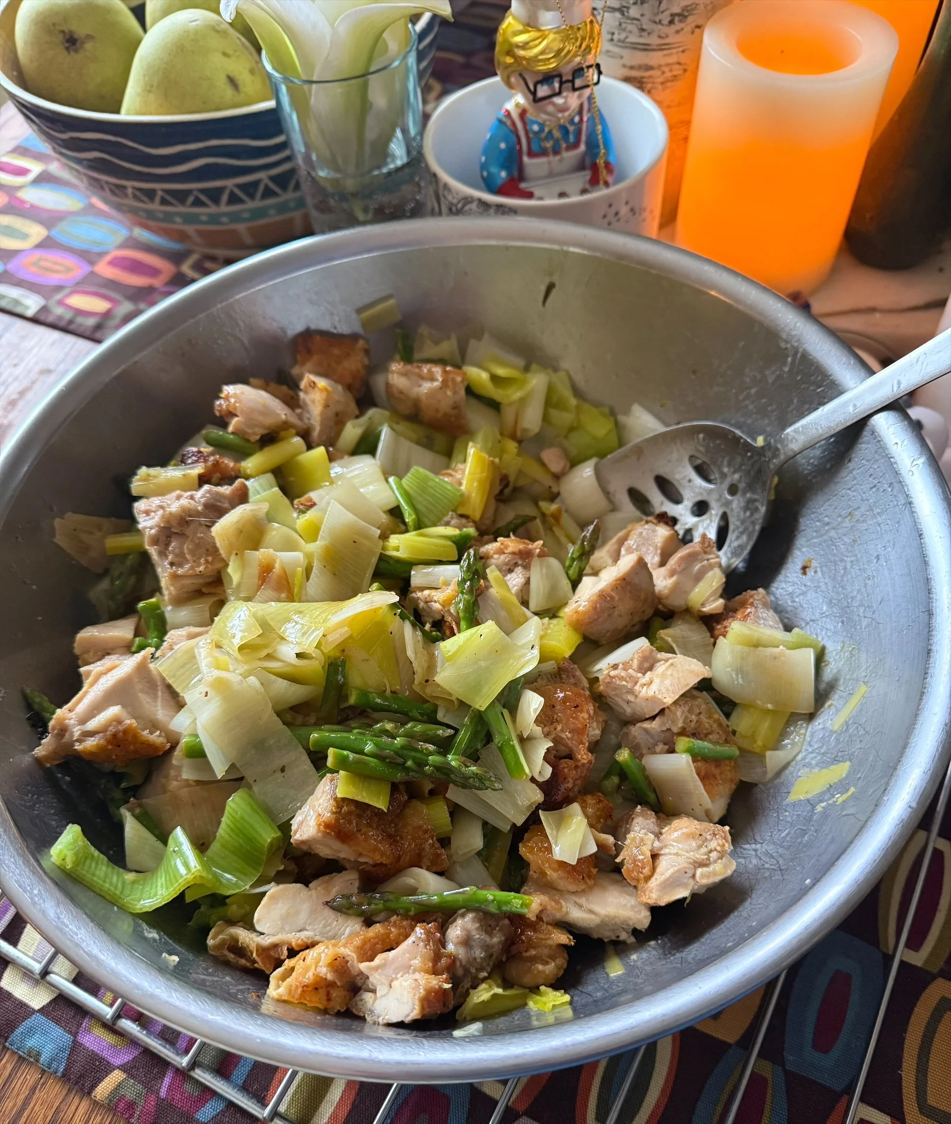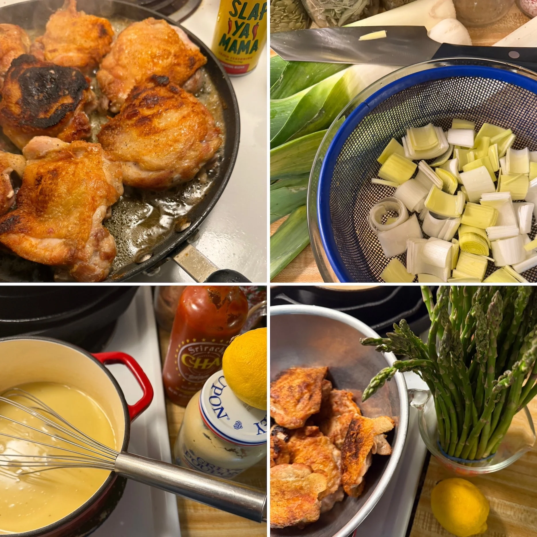 4) Sauté the drained leeks in the reserved chicken fat until just tender. Remove them with a slotted spoon and add them to the chicken. Then sauté the asparagus in the same fat until just tender and add them to the chicken. Add the zest and juice of a lemon and then season the entire mixture with salt and pepper.