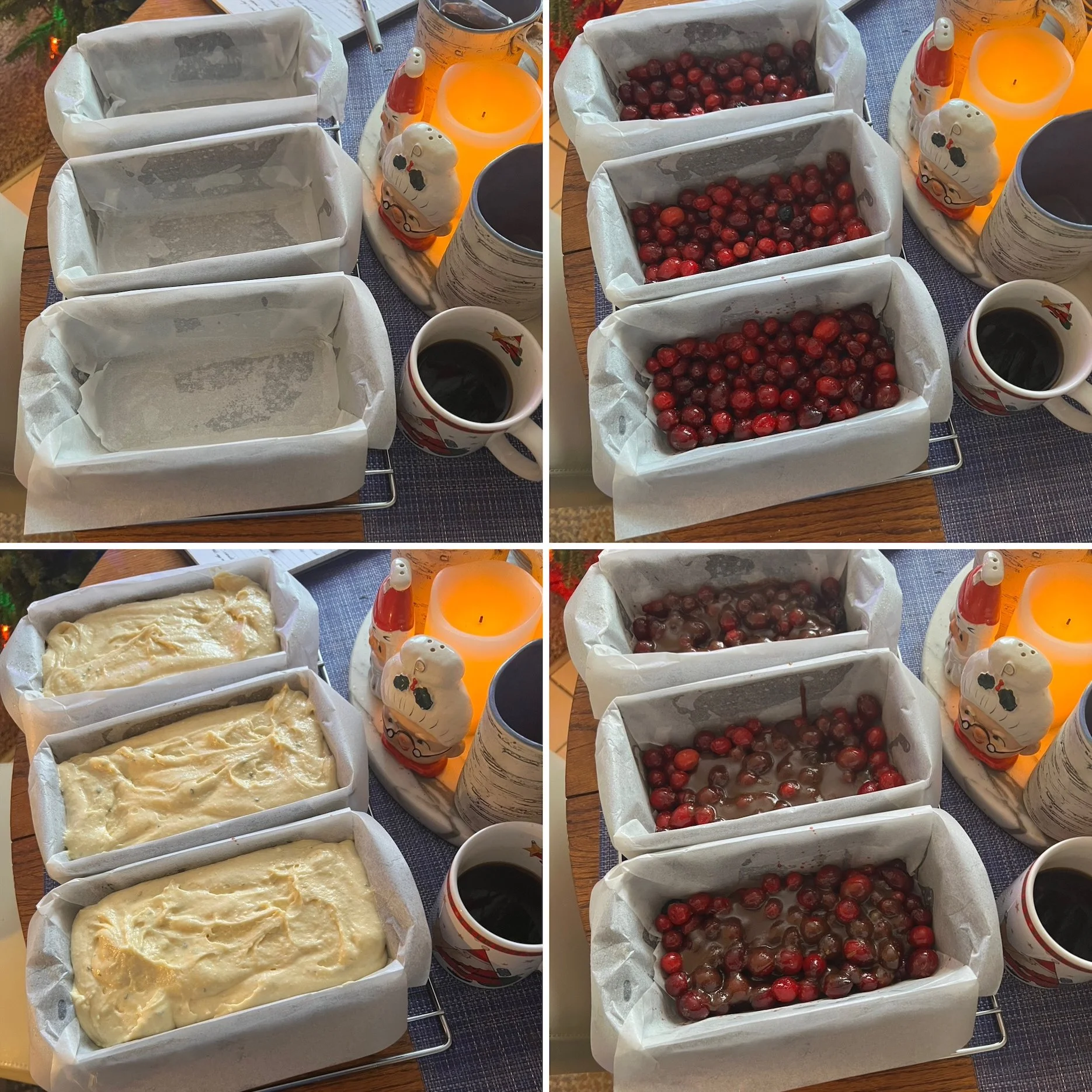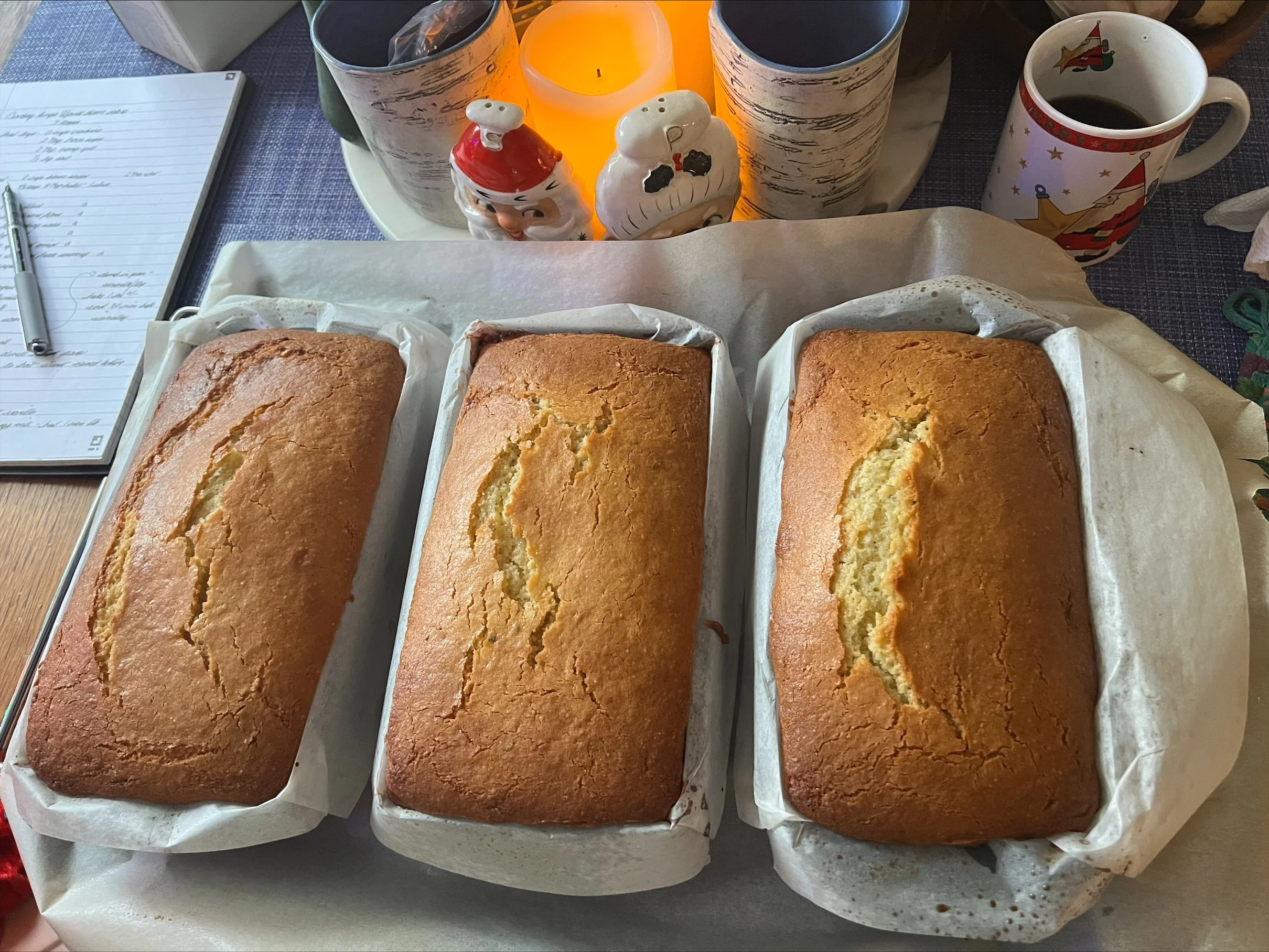 1) Preheat your oven to 325 degrees and line three loaf pans fully with parchment paper.