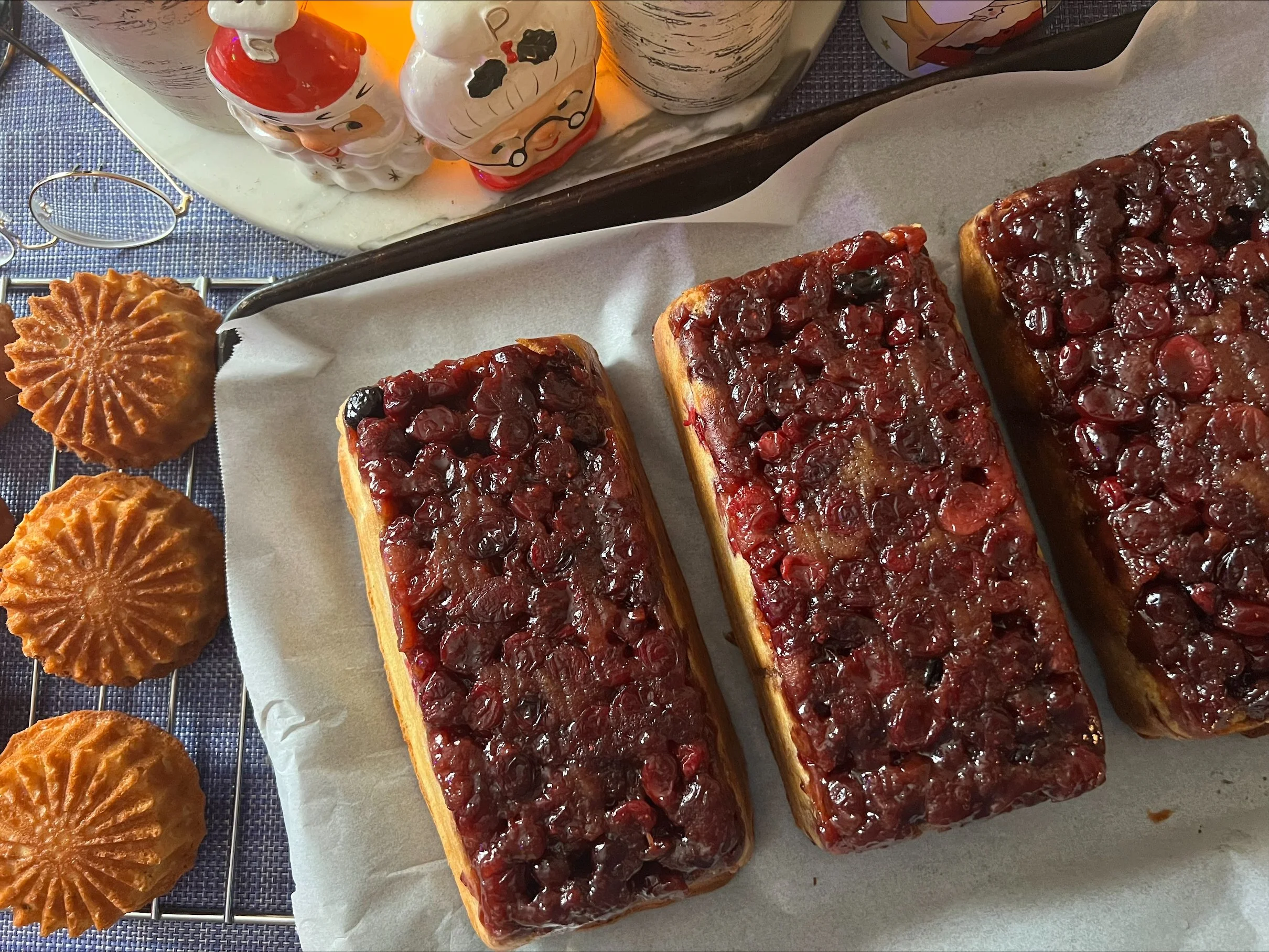 All these thoughts about “the upside down” followed me into the kitchen. Working with some of my favorite holiday flavors including cranberries, fresh rosemary and ginger, and anything caramel, I re-imagined a classic fruit upside down cake. I love the Tartine Bakery’s brilliant idea of baking cakes in a loaf pan. The resulting jewel-like cake glistens in it “upside downness” and literally pops with holiday warmth. It makes me feel like I am “dancing on the ground – but am I right side up or upside down?” And honestly, who’s to say?
