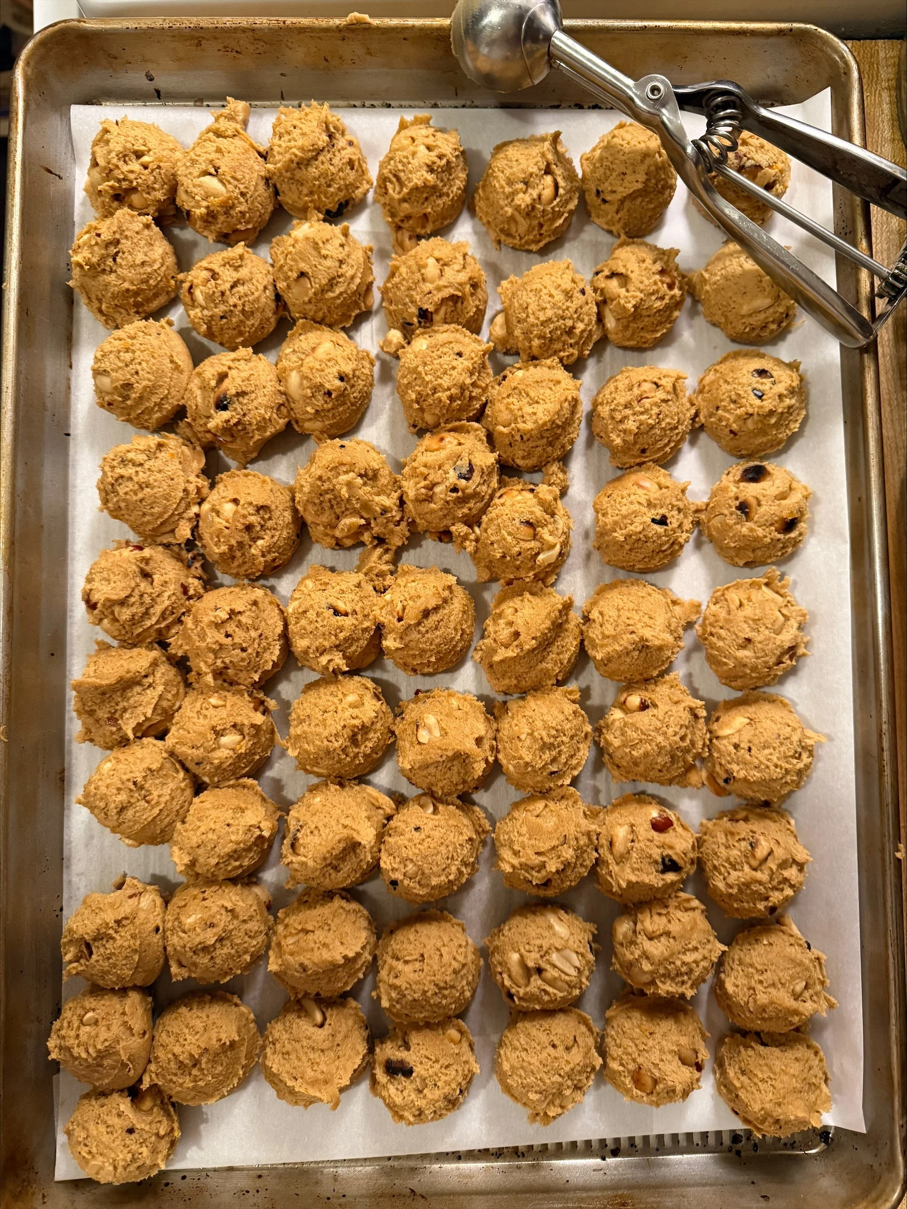 5) Line a baking sheet with parchment paper. Using a cookie scoop, portion the dough into 5 dozen balls. Chill on the sheet in the refrigerator for at least one hour.