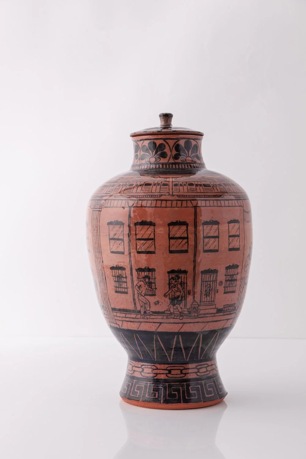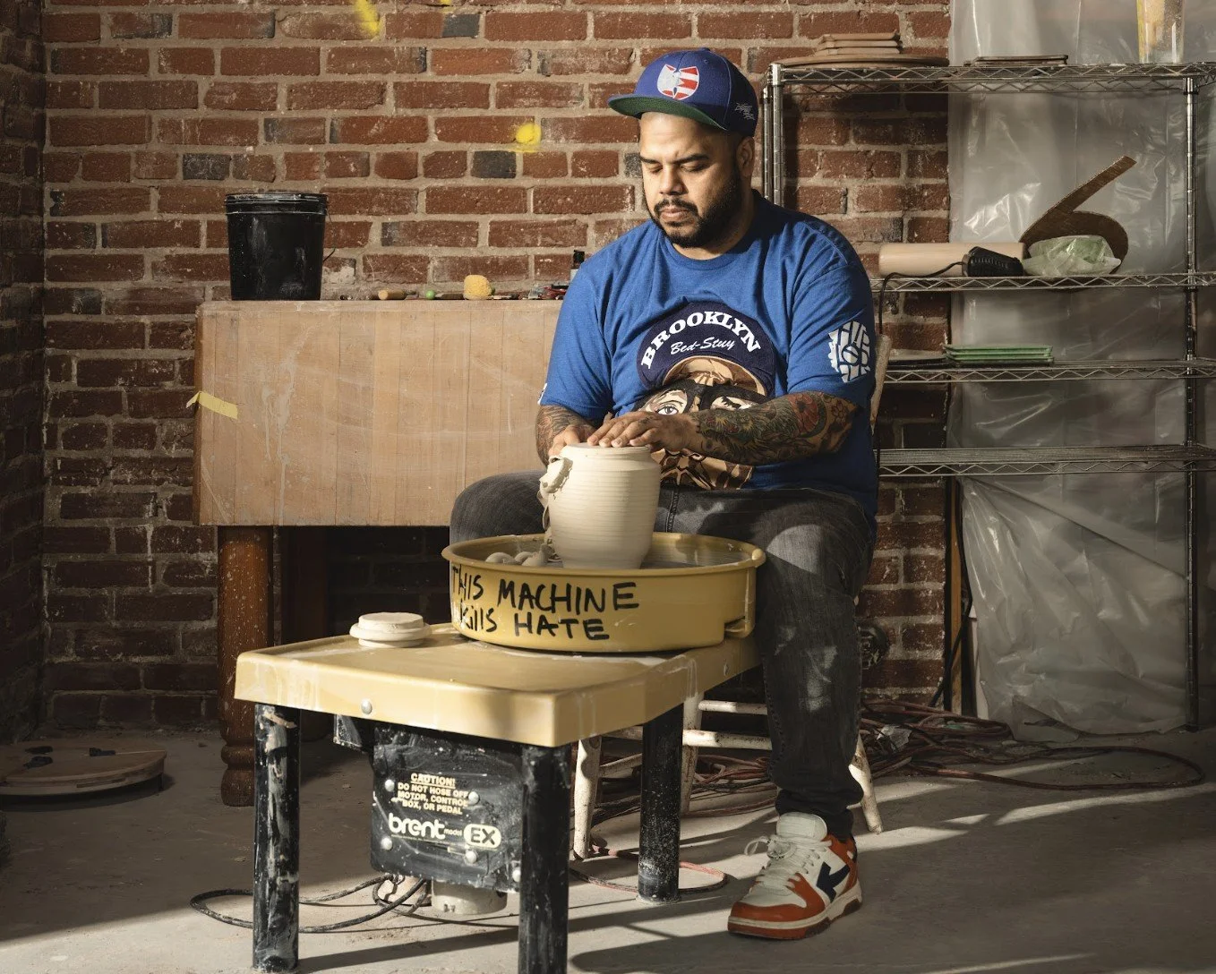 Roberto Lugo is a Philadelphia-based artist, ceramicist, social activist, poet, and educator. According to his website bio, “Lugo utilizes classical pottery forms in conjunction with portraiture and surface design reminiscent of his North Philadelphia upbringing and Hip Hop culture to highlight themes of poverty, inequality, and racial injustice.”
