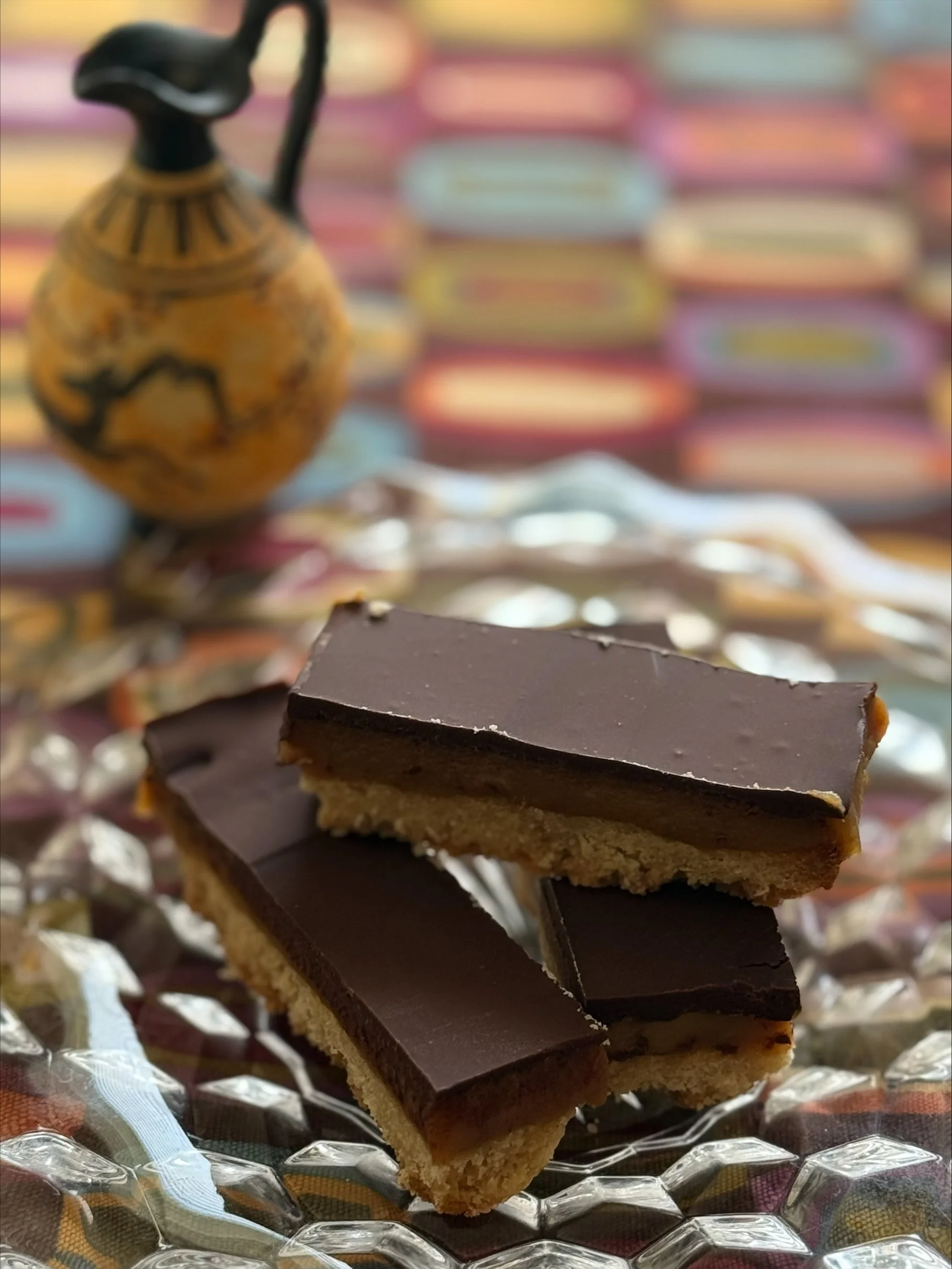 The colors and forms of Lugo’s art inspired me to re-examine an aged culinary classic with a personalized modern approach. His chosen palate easily danced with mine, reinterpreted in warm caramel and rich dark chocolate, both secured on a sturdy foundation of Scottish shortbread. The hint of cinnamon in the crust and the surprise of chili powder in the chocolate provide my own bit of “bibbidy-bobbidy boo.” As I finished this writing, I thoroughly enjoyed two of these scrumptious morsels served on one of my grandmother’s antique glass plates, and offered up an encouraging wink to Artemis as she forever hunts her golden-antlered deer within the oinchoe forest.
