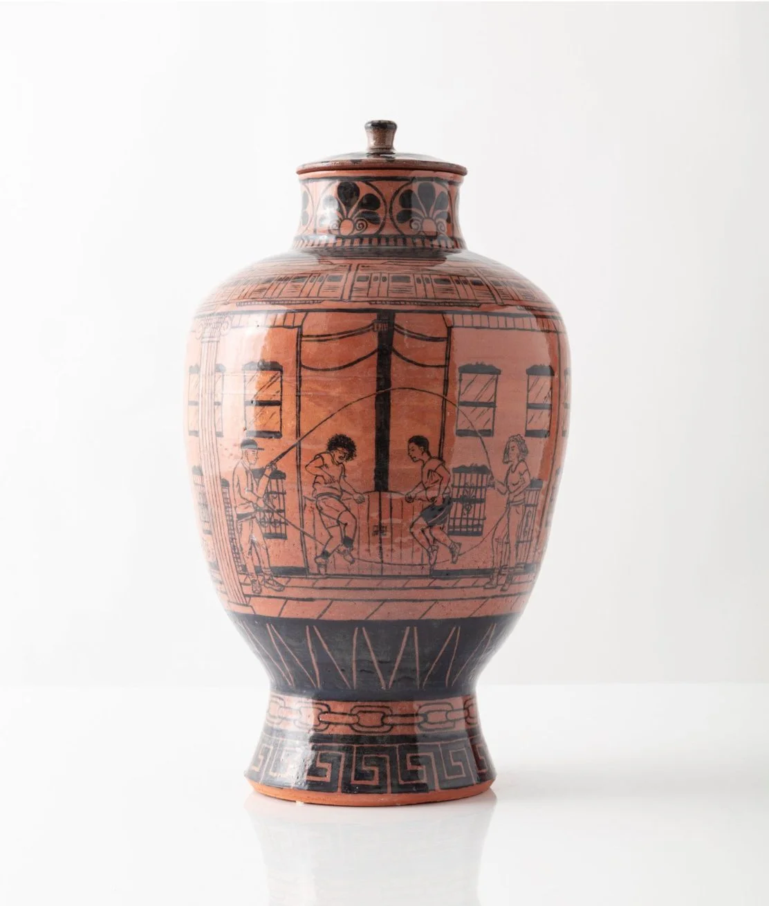 “The show,” continues Abdessamad, “takes a breathtaking turn in his “Orange and Black” series, in which Lugo imaginatively expresses personal narration via classically inspired amphorae.” The title of the series nods to black-figure Greek pottery painting, which peaked in ancient Athens between the 7th-6th century BCE. Lugo’s large black-figure amphorae are divided into multi-tier segments like comic strips, narrating different stories personal to the artist in a “remixing” of historical inspirations with motifs inspired by the street, like fire hydrants, children jumping rope, and loud graffiti.