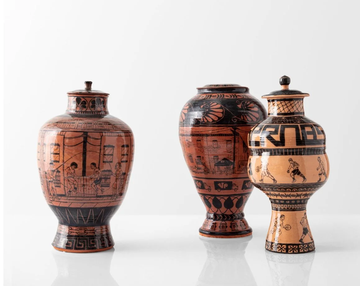 But for me, it is Lugo’s re-interpretation of Classic Greek Pottery that draws me in like warm honey on a buttered biscuit. His 2023 debut solo showcasing reinterpretations of ancient ceramics in New York City “packed a lot of energy and echoes the distinctive voice of the ceramicist-activist,” writes Farah Abdessamad, for “The Observer.”