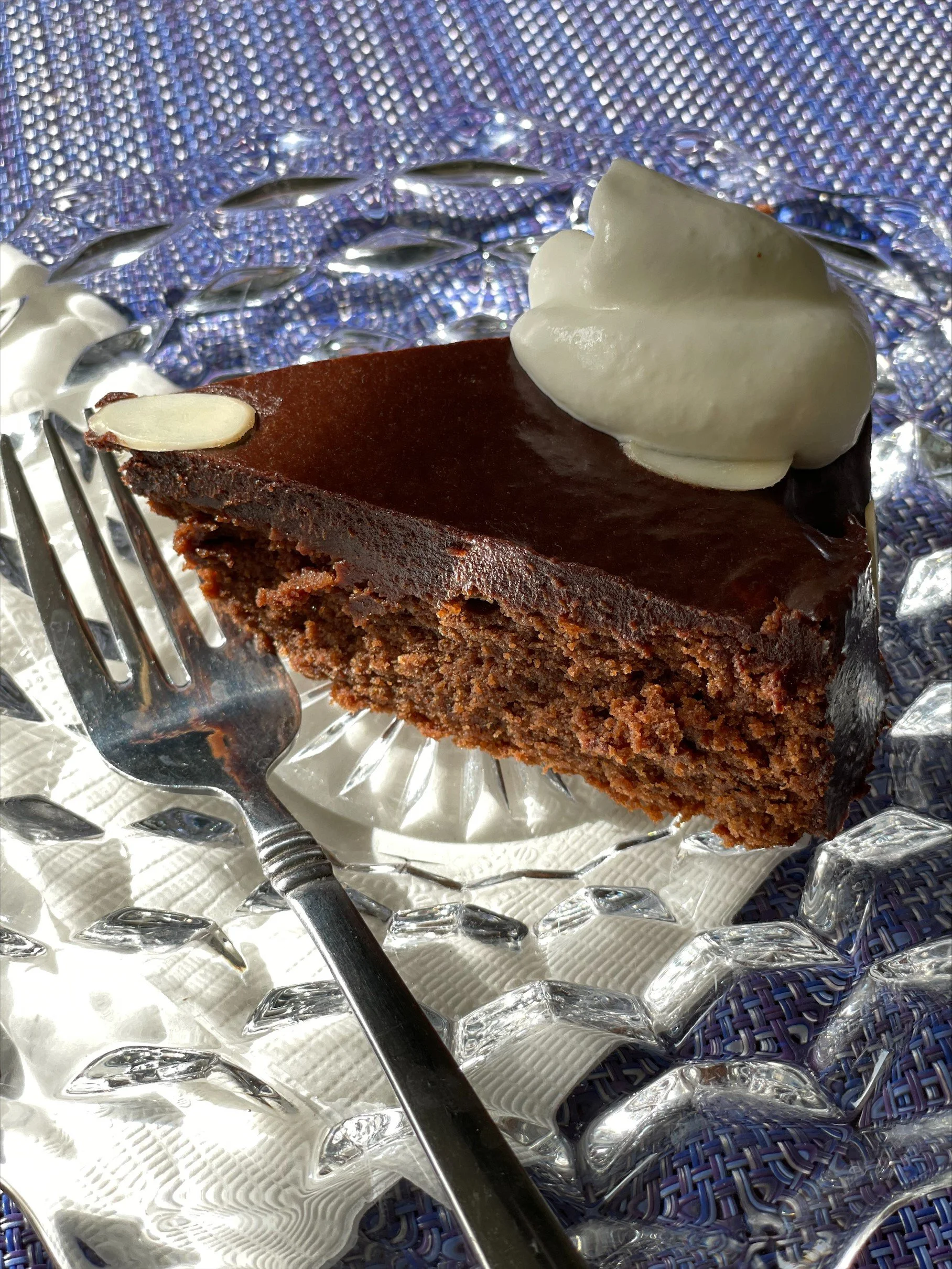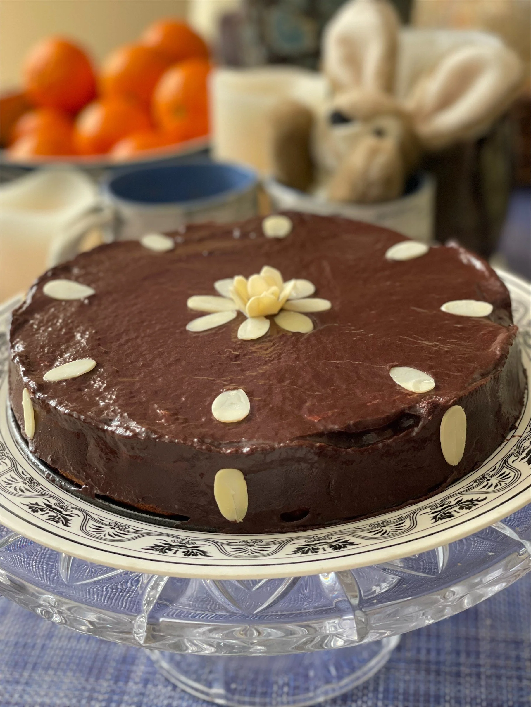 8) For the icing: Using a double boiler (or a bowl sitting over a pan of barely simmering water), melt the dark chocolate and the hydrated espresso powder until smooth. Remove from the heat and whisk in the butter, one Tbsp at a time, until smooth, glossy and spreadable. Cover the cake with the icing and decorate with almond slices. This is your chance to be creative!