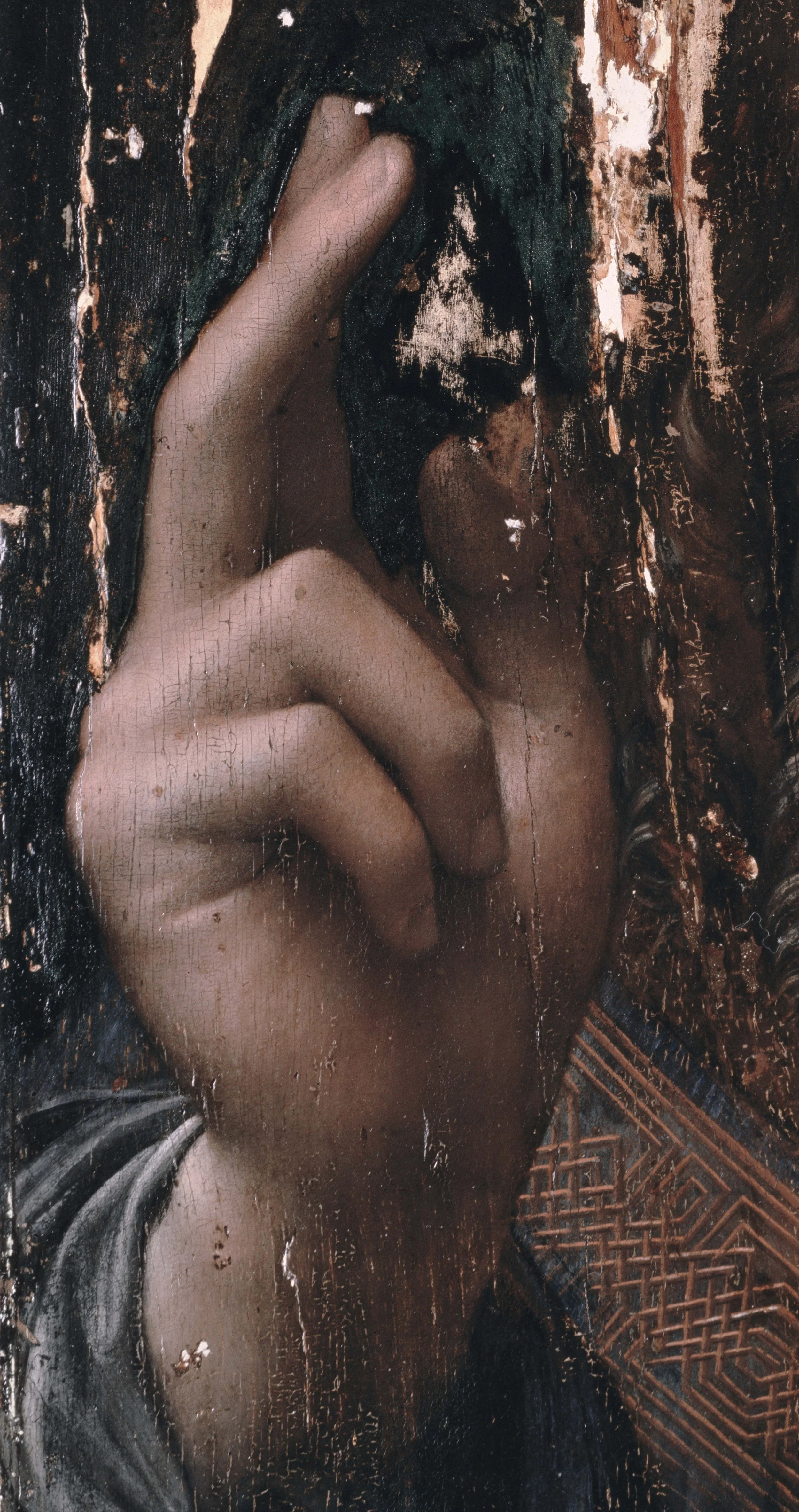During her extensive cleaning of the work, she had discovered a “second thumb” on the hand raised in blessing. In her website, Modestini writes: “The most obvious pentimento (a change of mind) is of the thumb of the blessing hand, which had been exposed during the radical scraping away of the original black background in the past and was immediately visible when the painting was first cleaned. It is only a small adjustment, but it was evidently of great importance for the painter to make a major change at such a late state in the development of the final composition.” This decision was a meaningful revision and historically not an adjustment a copyist would make. Based on this artistic choice and other noticeable da Vinci traits, such as the Salvator’s lips being painted in the exact same smokey manner as the “Mona Lisa’s,” Modestini reached the conclusion that the work before her could not have been painted by anyone other than Leonardo.