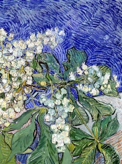 But, dear reader, you may ask, what brought us to this conversation today? To be plain, it was a Saturday afternoon’s delicious conversation with my bestie Vincent van Gogh. In fact, the first open Saturday after spending the last eight weeks morphing my soul with a certain insane King and his three daughters. I allowed my most recent Van Gogh exhibition catalogue to fall open, and there it was, Vincent’s spectacular interpretation of a chestnut tree whose branches were in full bloom with puffs of white petals swaying in the summer breeze of his mind.