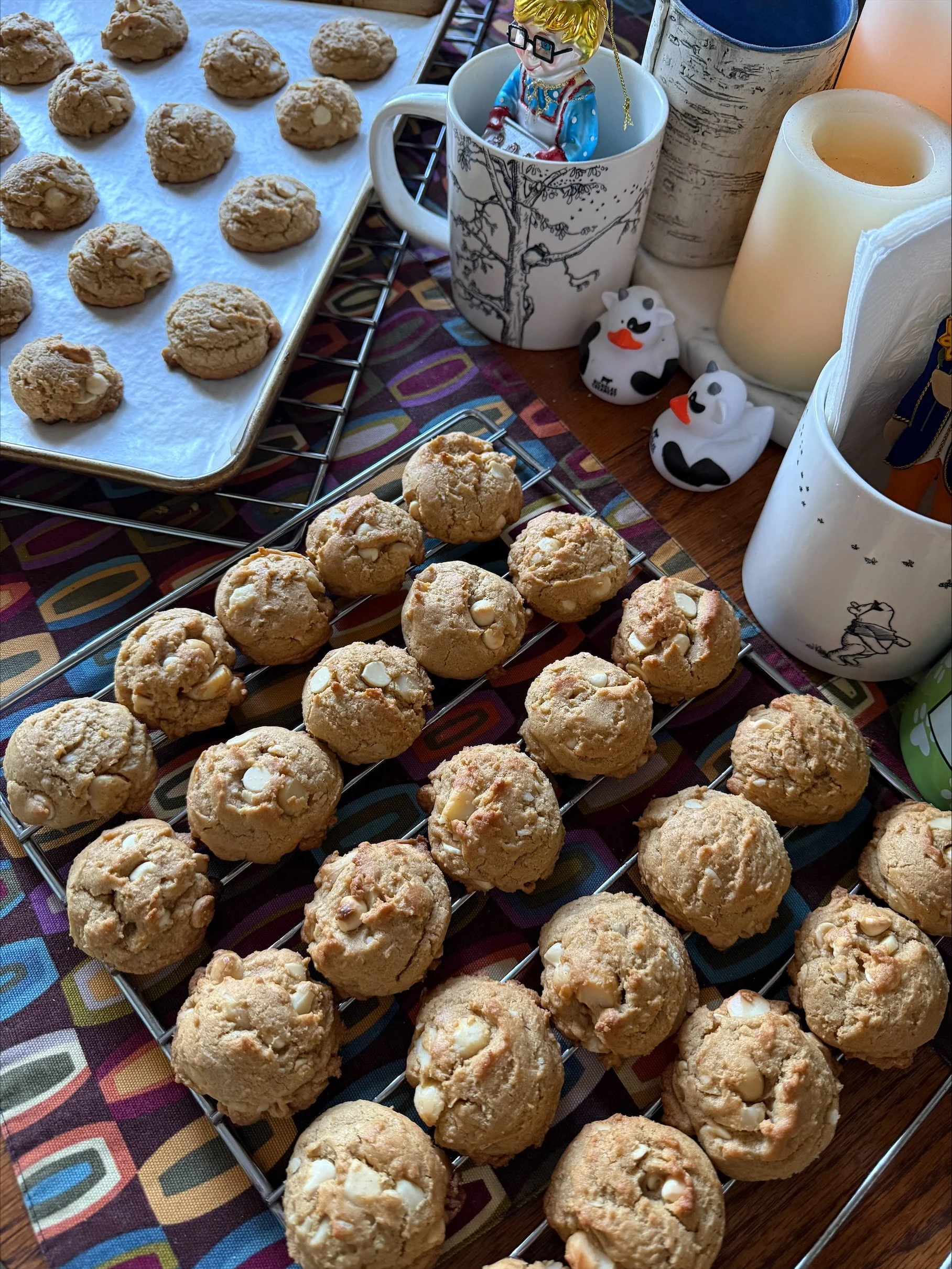 Hunger must have surfaced as I further studied the masterwork. Suddenly, the puffs of blonde petals mysteriously transformed into bunches of white chocolate chips and perfectly round Macadamia nuts. The branches and wooden table converted into a pleasantly crisp (and chewy) warm cookie dusted with confection’s sugar and I knew it was time to tie on the apron and fire up the oven.