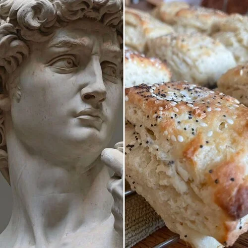 12) Cut the dough right down the middle creating two 12” inch long pieces. Then cut the two pieces into six equal sections creating 12 biscuits (Ill. 3).