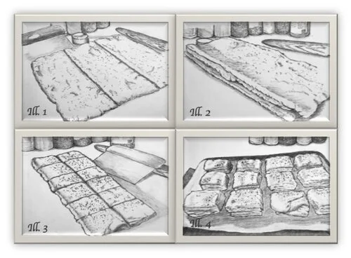 8) Cut the dough into three 4” by 12” pieces and stack them on top of each other creating one 4” by 12” piece (Ill. 1 and 2).