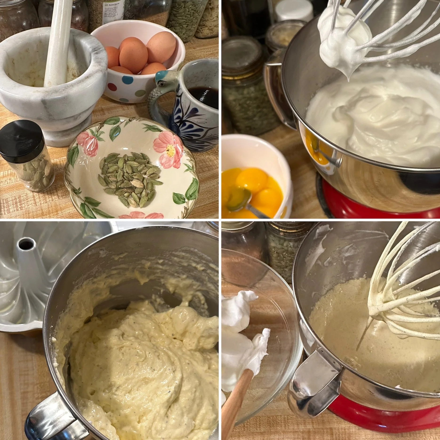 5) Return the bowl to the mixer and whisk together the sugar, cardamom, yolks, and vanilla until creamy yellow, about one minute.