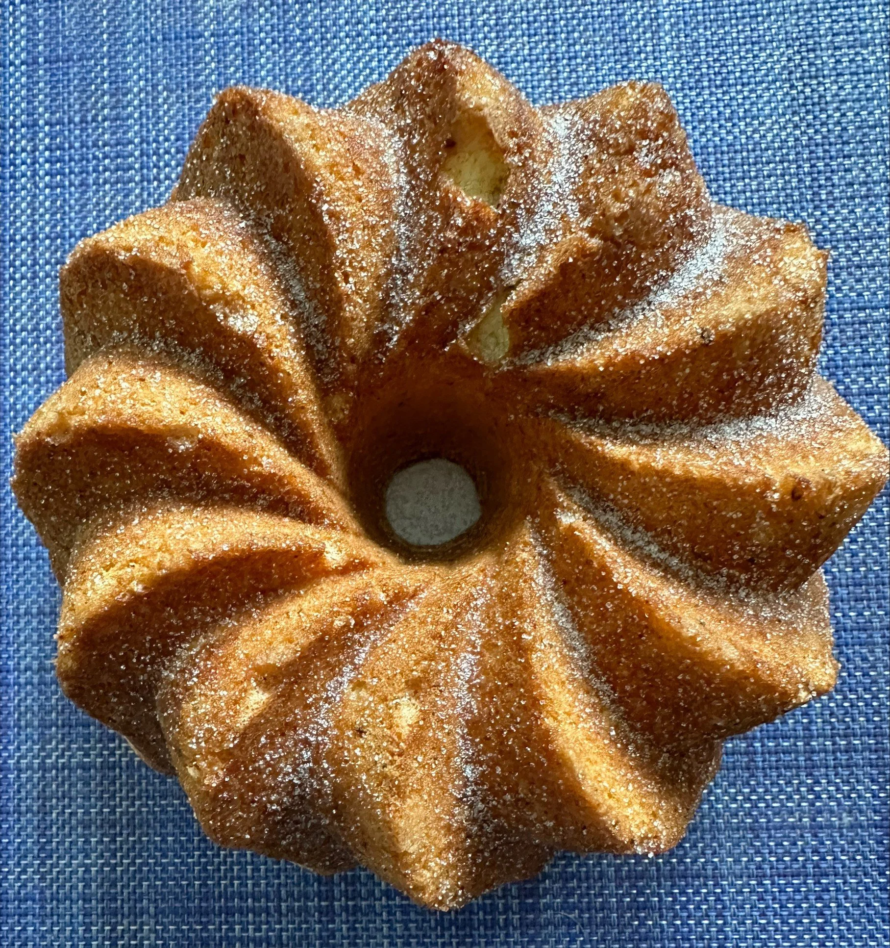 8) Let the cake cool completely in the pan and then invert onto your serving plate. Lightly dust the top with granulated sugar.
