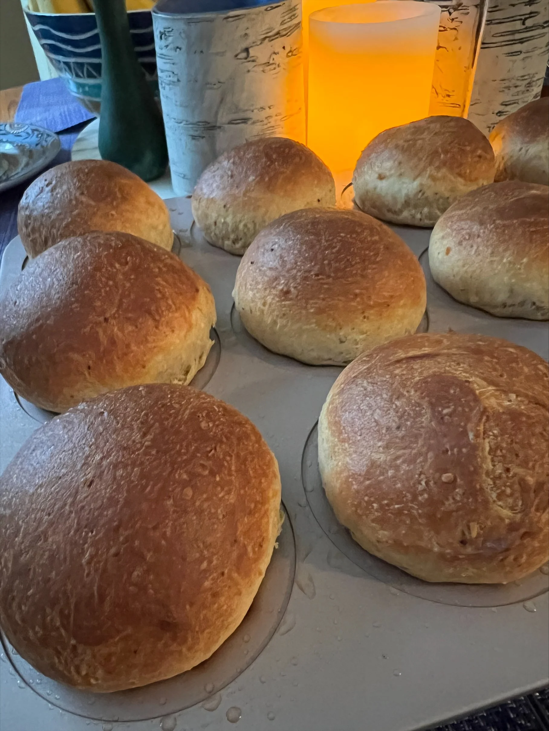 8) Preheat your oven to 400 degrees. Bake the loaves for thirty minutes until golden and a skewer comes out clean. Smaller loaves will take less time. My twelve individual rolls baked in fifteen minutes. Let them cool in the pan for five minutes and then cool completely on wire rack – if you can wait that long!