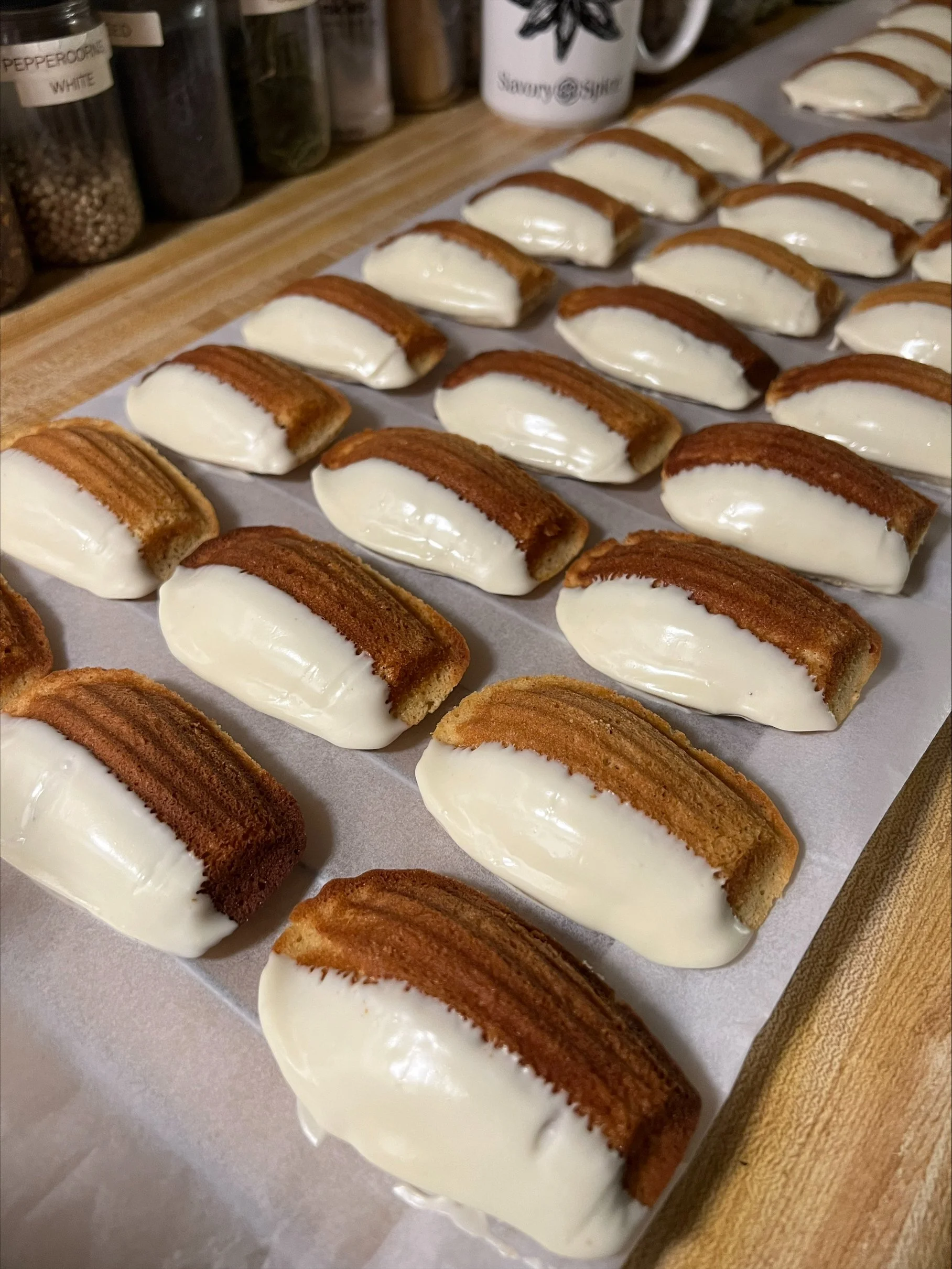 7) While the madeleines are baking, melt your white chocolate either over a double bowler, or carefully in the microwave using 20 second zaps (and stirring between each zap). While the madeleines are still warm, dip into the white chocolate and place on a sheet of parchment to set the chocolate.