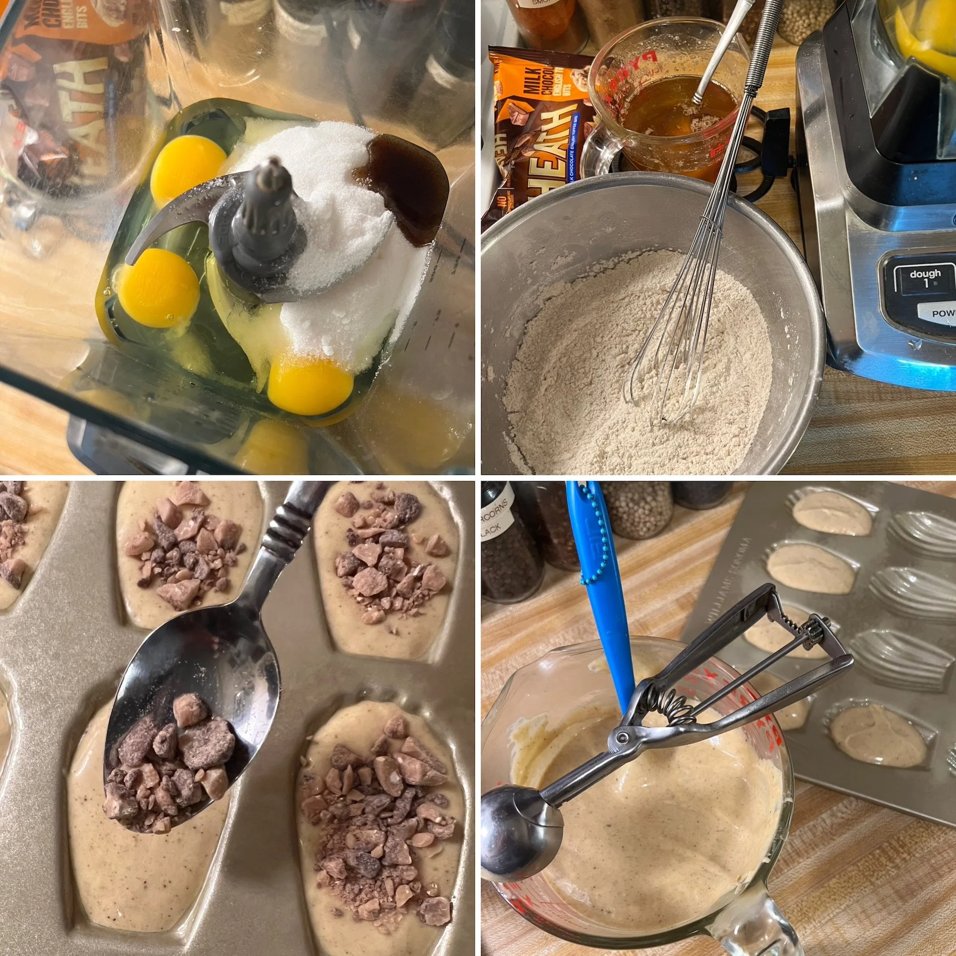 5) Portion the batter into the individual madeleine wells - 2/3 full. Sprinkle 1 tsp toffee bits on top of the batter, making sure none of the toffee is touching the pan.