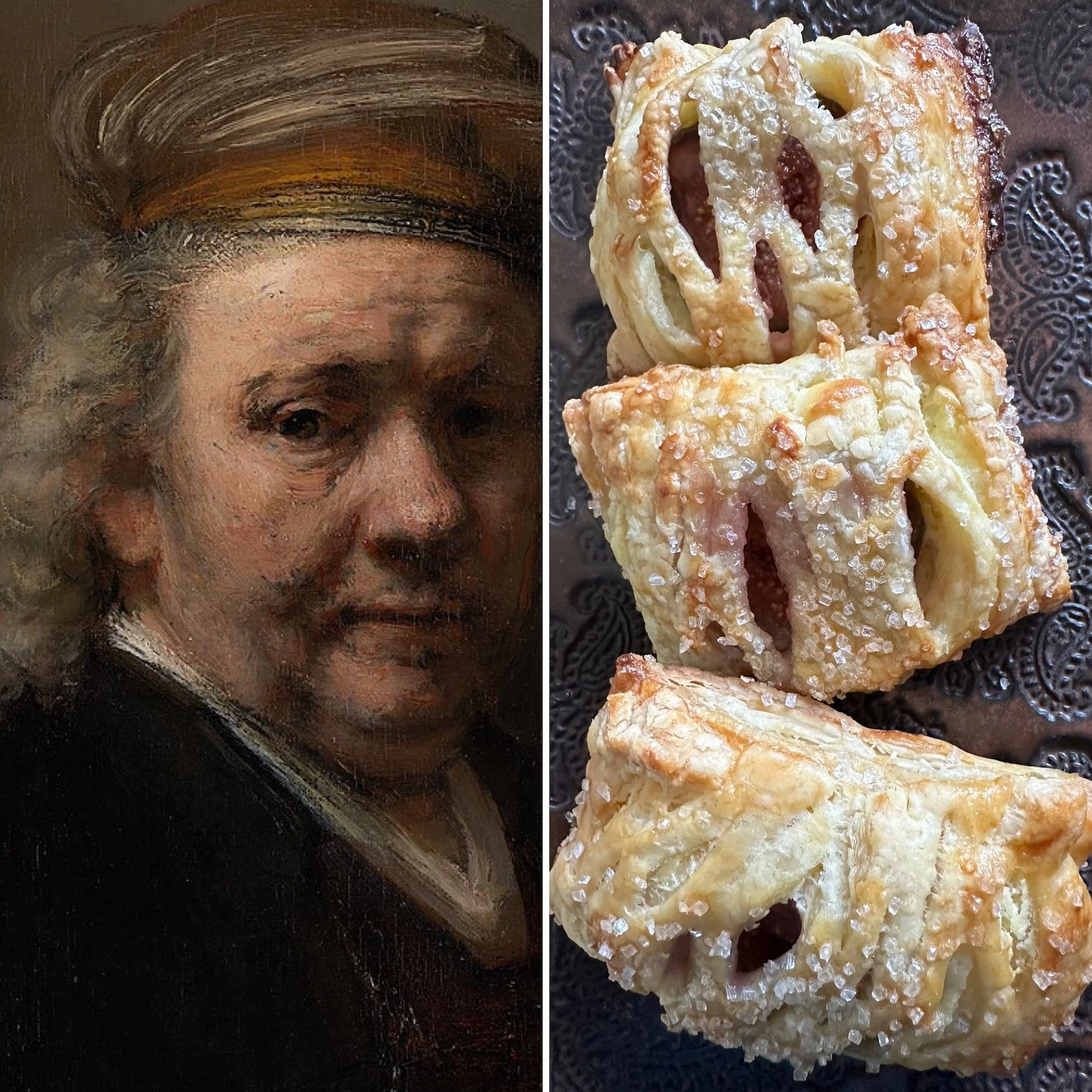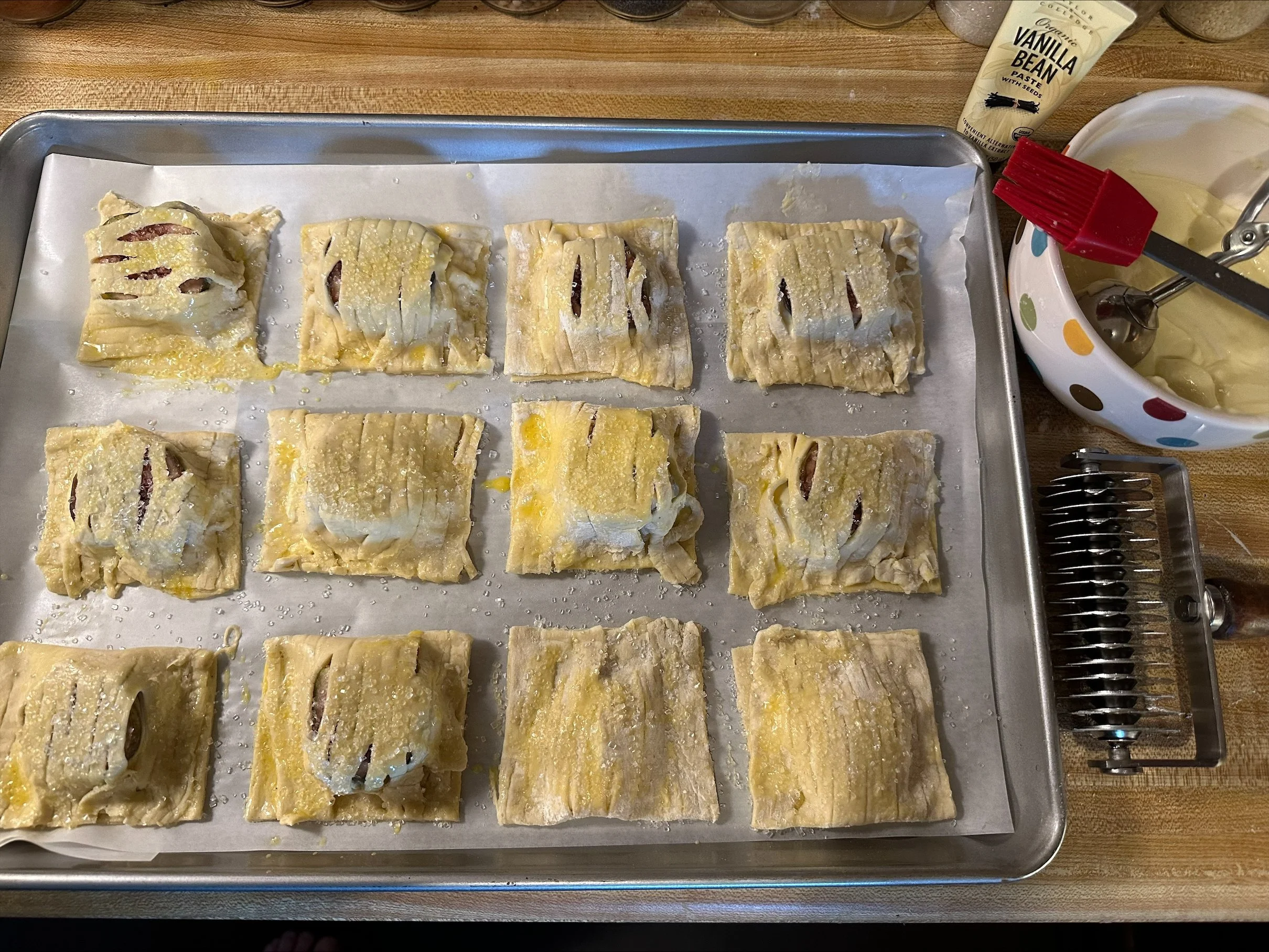 5) Lightly brush the top of the Danish with egg wash and sprinkle with sanding sugar. Bake on the center rack for 15 minutes, rotate the pan, and bake for another 6-8 minutes until golden brown and the fig juice starts to bubble. Cool on the pan for five minutes and then remove the Danish to a wire rack to cool another ten minutes before serving. The cream cheese filling will be hot!