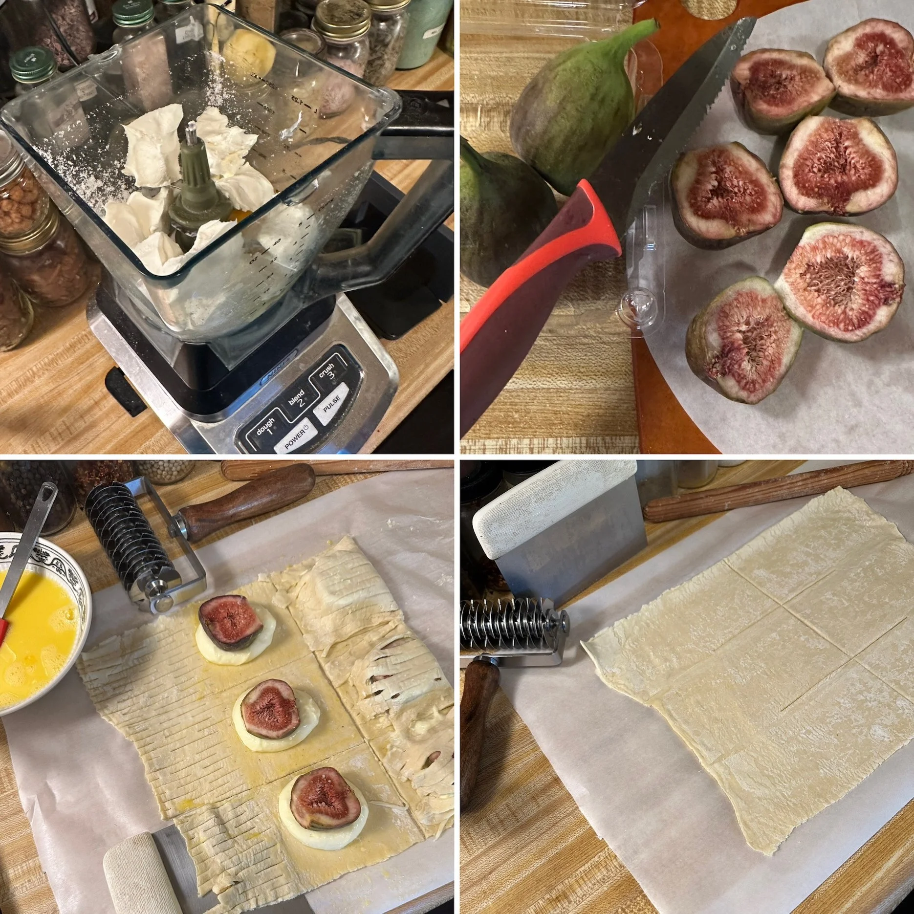 4) Roll the first sheet of puff pastry into a rectangle 9” x 15”. Cut in half (9” by 7 ½”). Score each half into three rectangles. Using a Pastry Lattice Roller, lattice the outer half of each rectangle. Brush the solid half with a light coat of egg wash. Place one Tbsp of the filling in the center and top with a fig half (cut side up). Fold the lattice top over and use your finger to seal the edges. Place the Danish on the prepared baking sheet. Repeat with the second sheet of puff pastry.