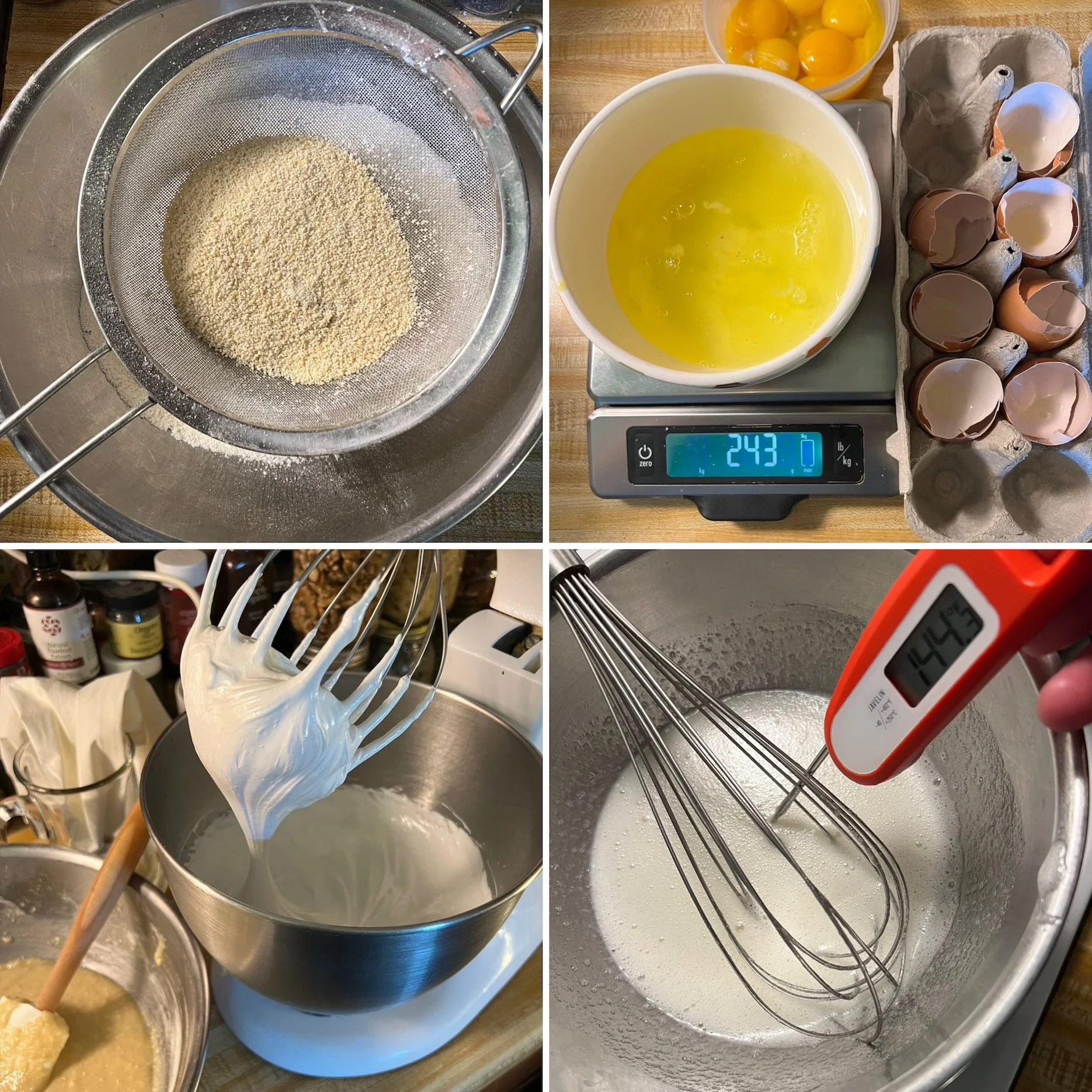5) Place the remaining egg whites in a smaller bowl and add the granulated sugar. Place the bowl over a pan of simmering water and gently whisk until the sugar is melted and the mixture reaches 150 degrees F. (I use a digital thermometer.)