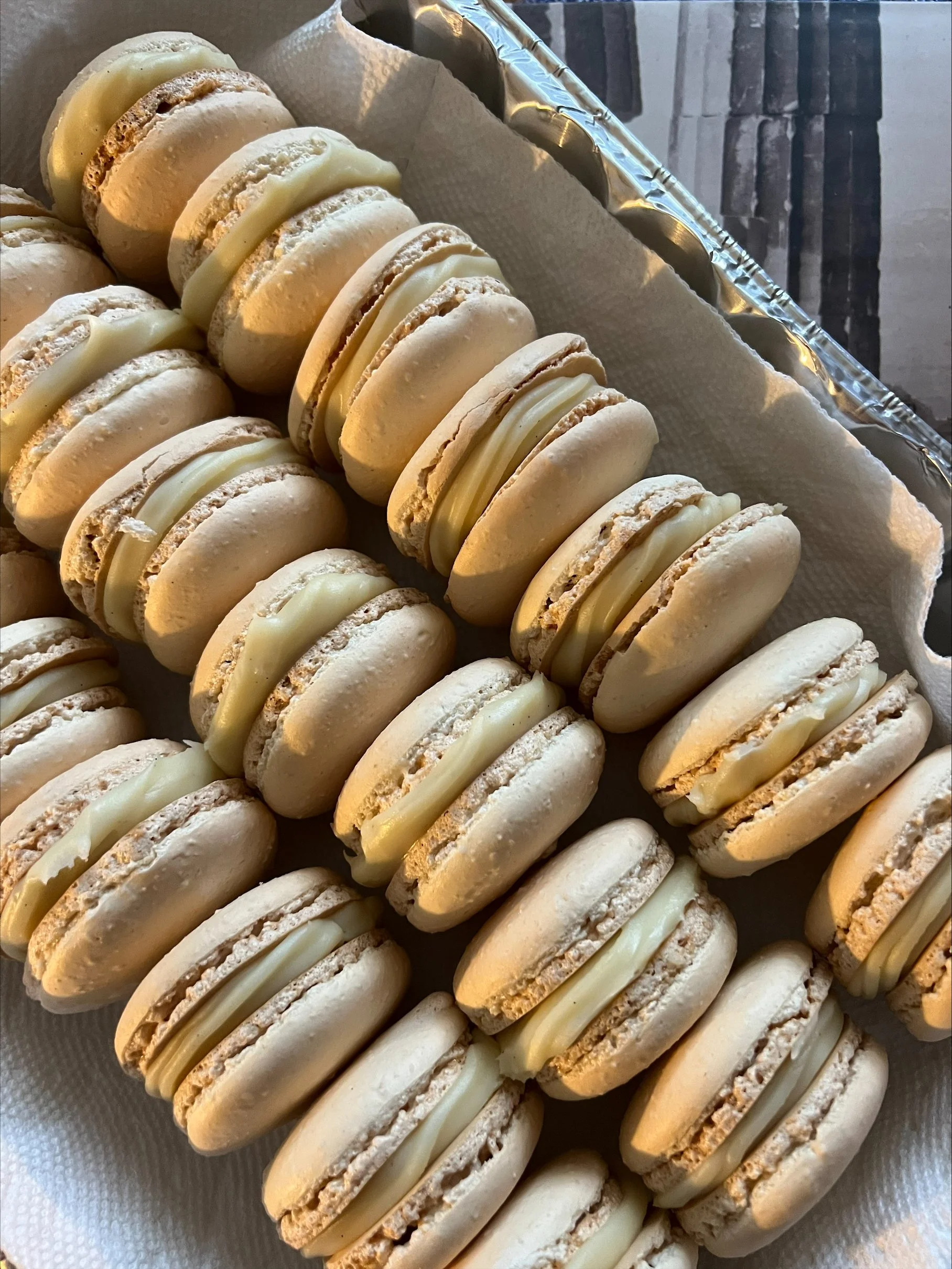 10) Preheat your oven to 300 degrees. Bake one pan at a time for fifteen minutes, rotating after nine minutes. Leave the macarons to cool completely on the baking sheets.
