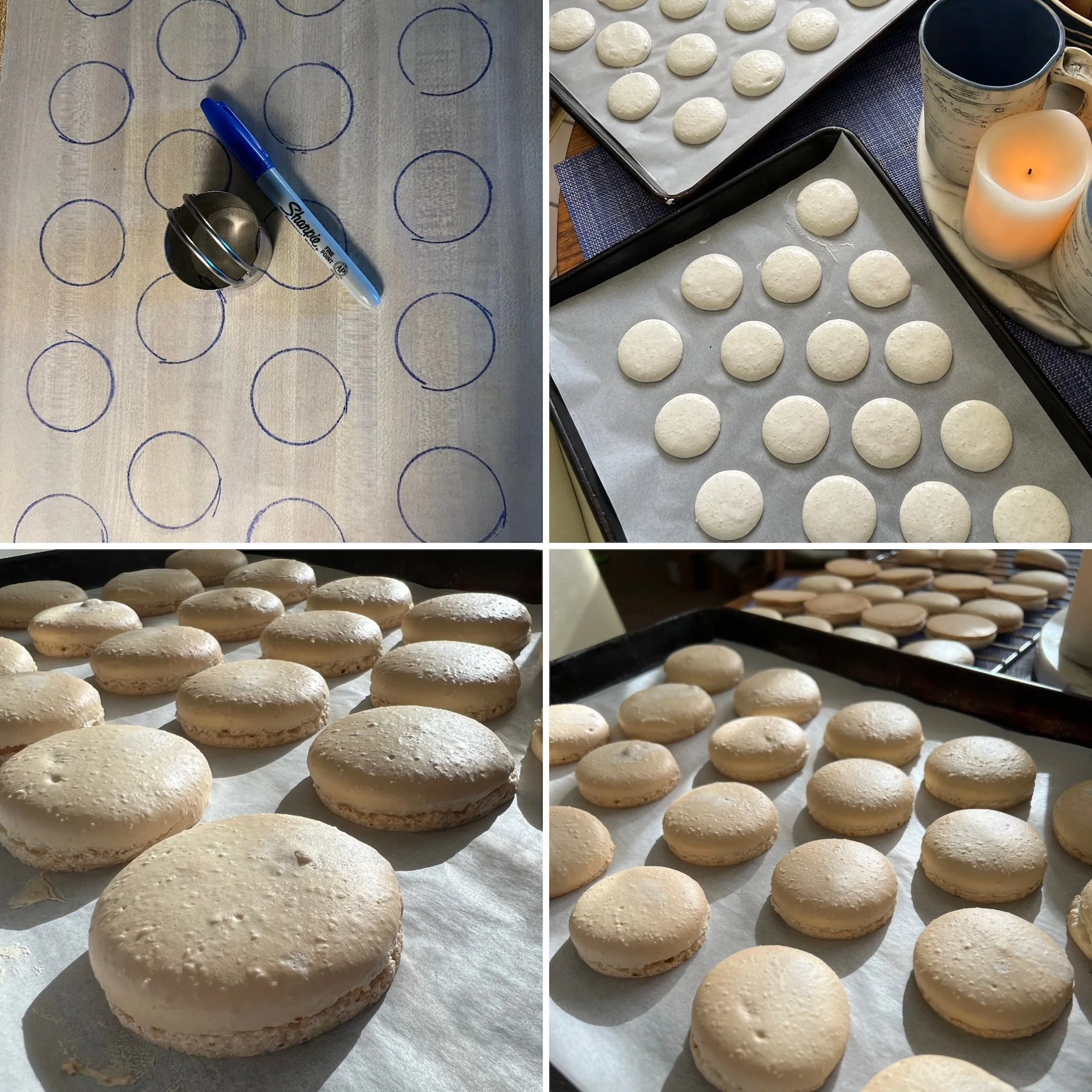 9) Gently slide the template out and follow the same procedure to pipe the circles on the second pan and then the third. Leave the pans, uncovered, for thirty minutes to dry the tops of your macarons before baking.