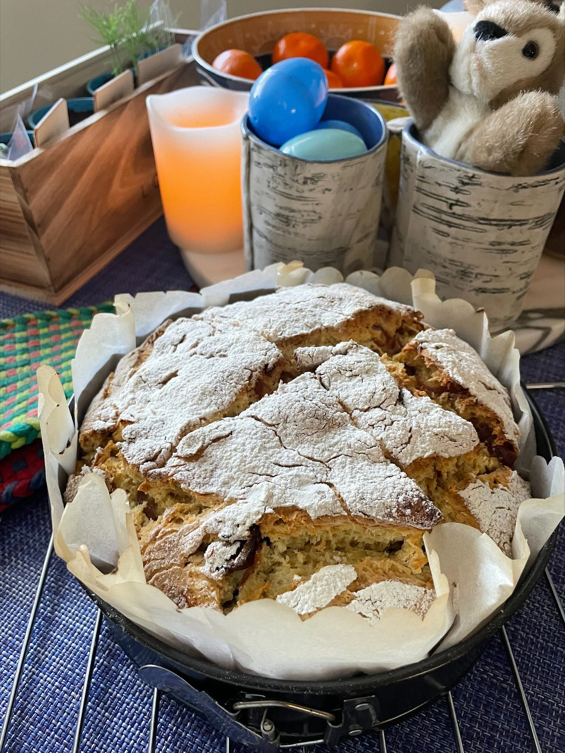 6) Bake the loaf for 45-50 minutes and then let cool on a wire rack ten minutes before releasing the springform removing the loaf. Let the loaf cool on the wire rack for another 20 minutes before slicing.