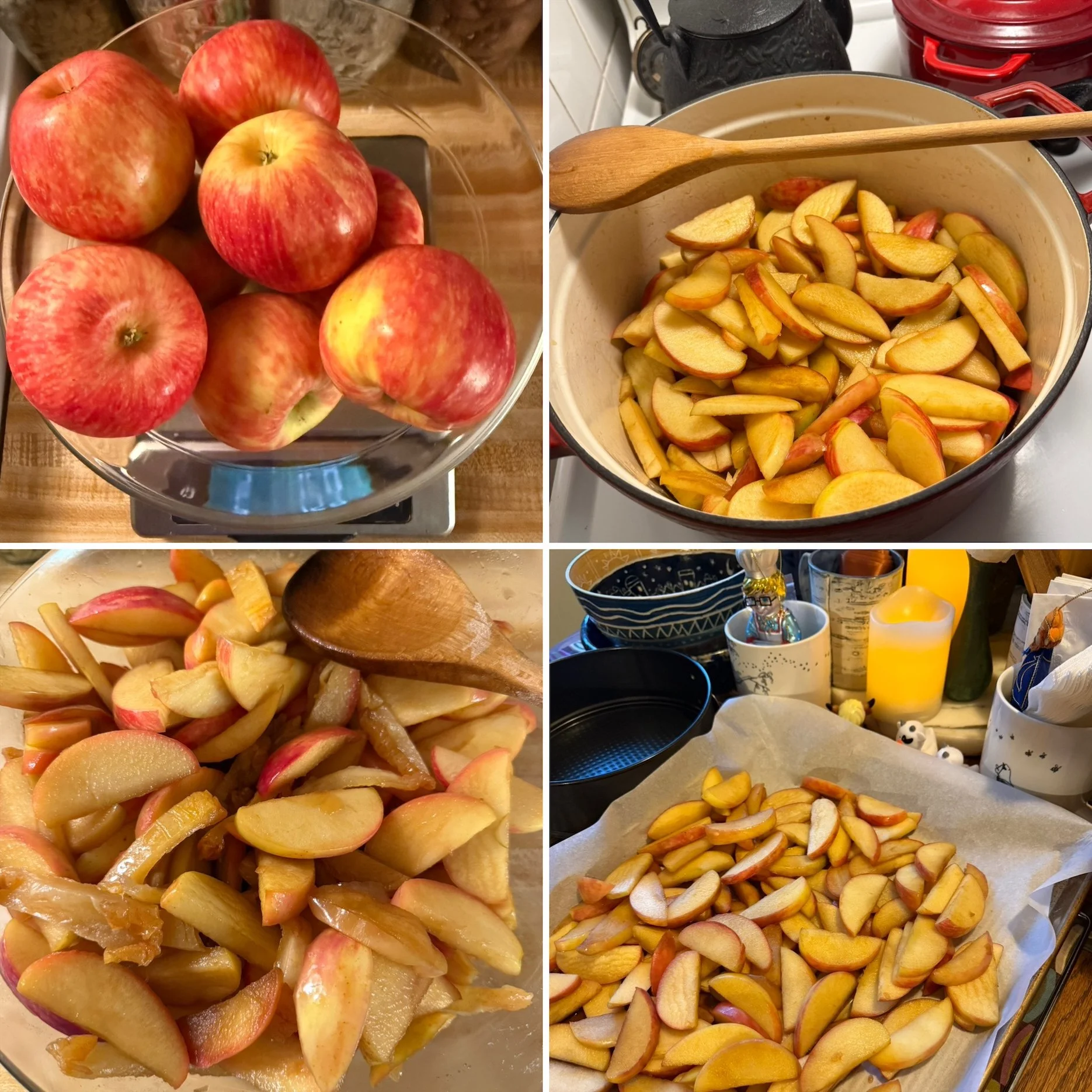 1) Core and slice the apples (about ¼” slices). Stir them together with the brown sugar in a large Dutch oven. Cover and cook over medium low heat for 8-10 minutes, stirring occasionally. Pour the apples onto a parchment lined baking tray and let cool for 30 minutes.