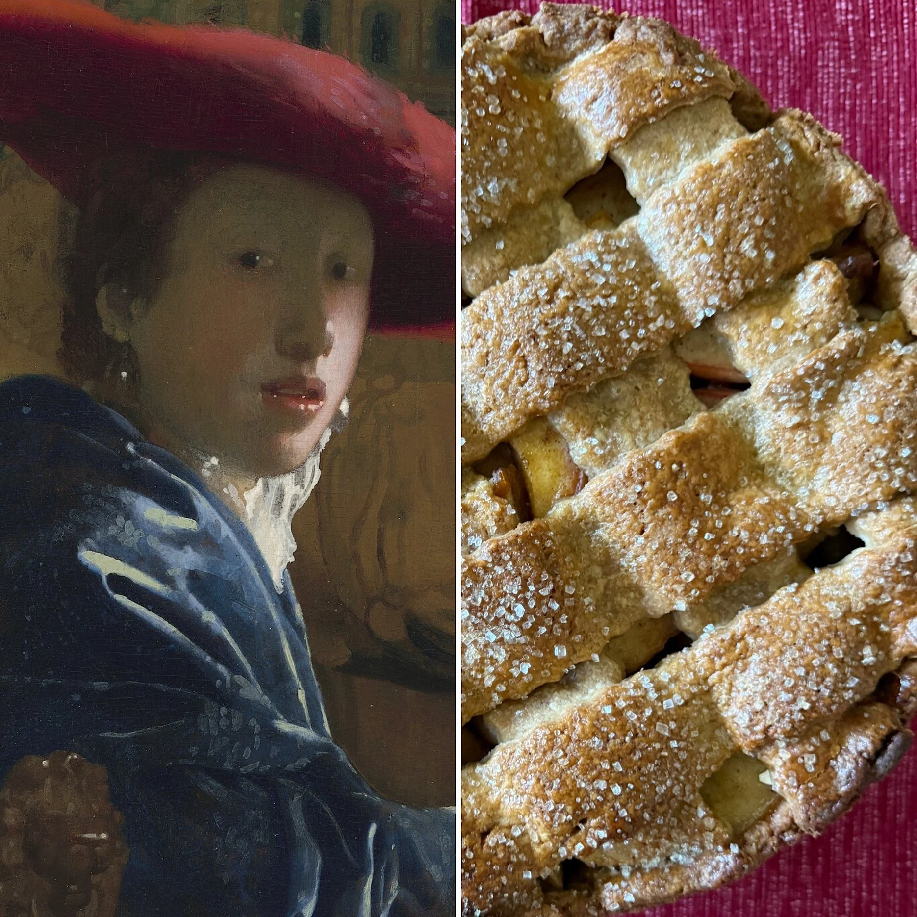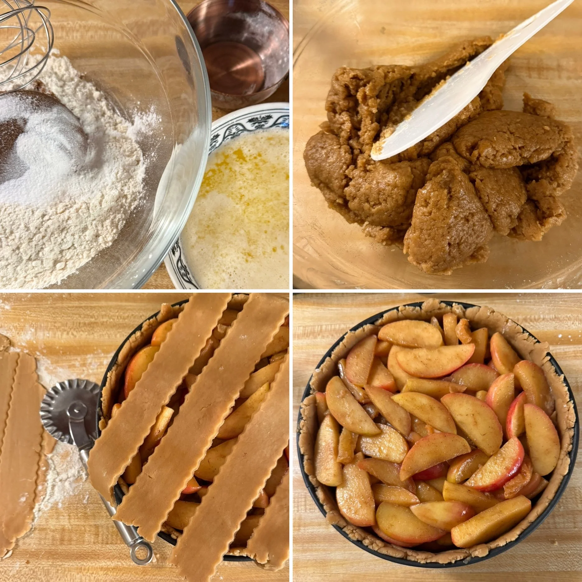 5) Roll the chilled first third into a 9” square. Cut into eight strips. Lay the first four strips over the apples. Rotate the pan and lay the remaining four strips. Lightly paint with an egg wash and sprinkle with sand sugar.