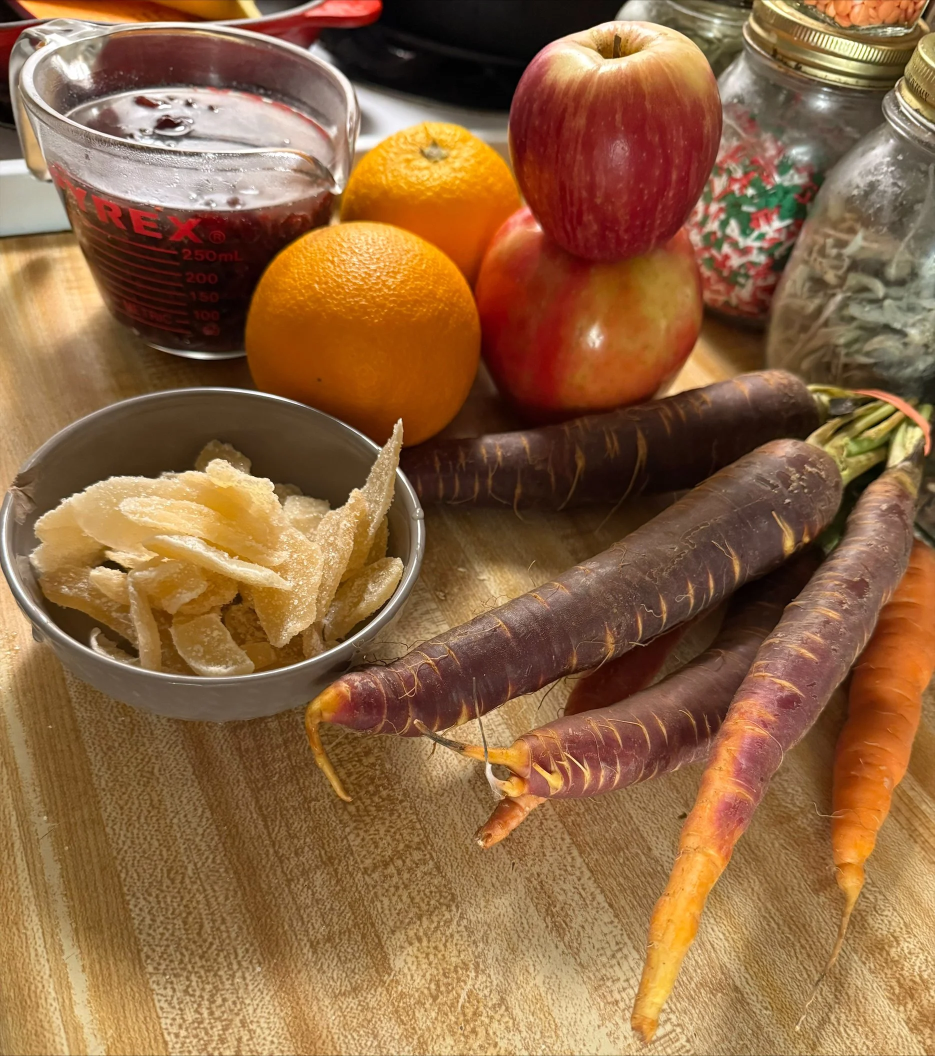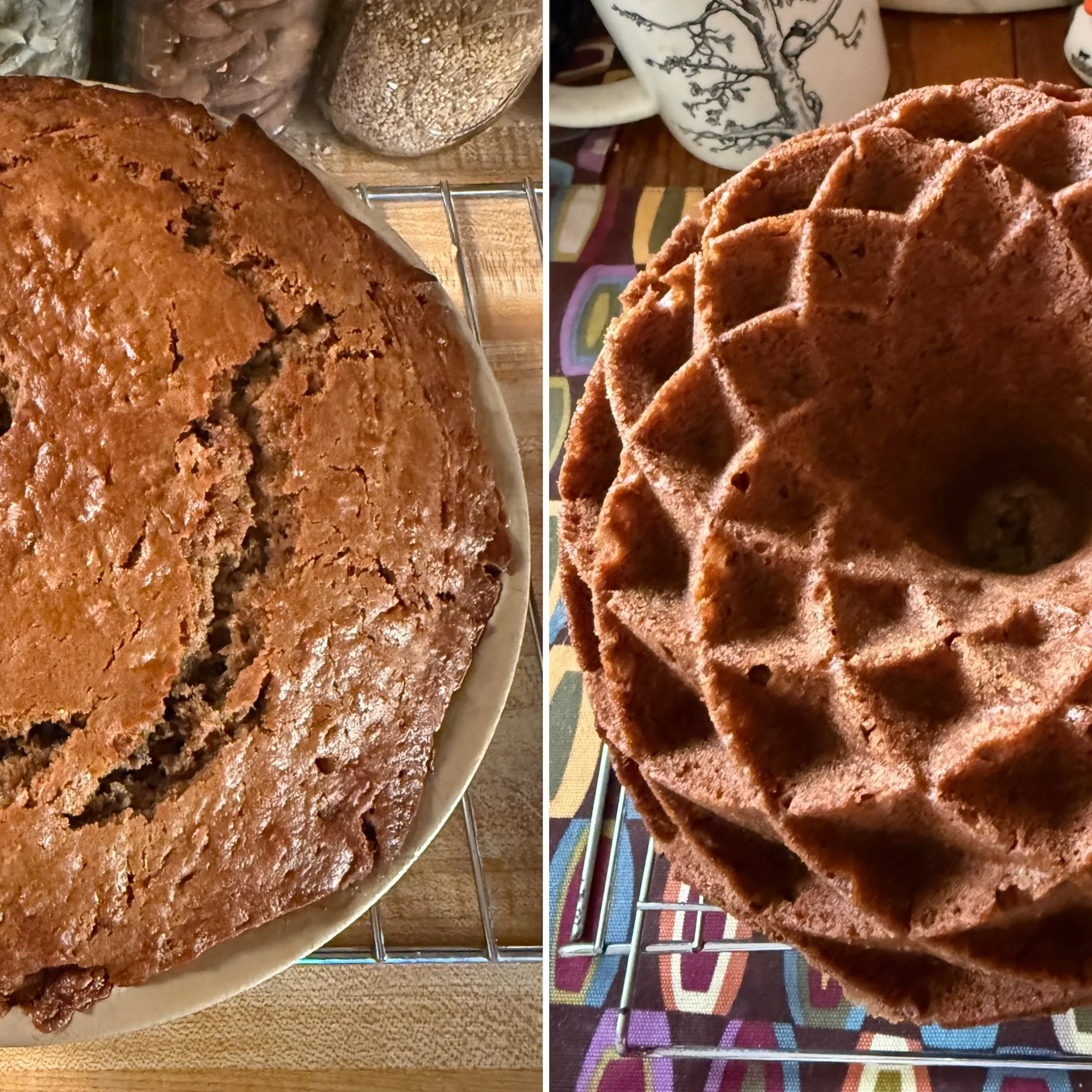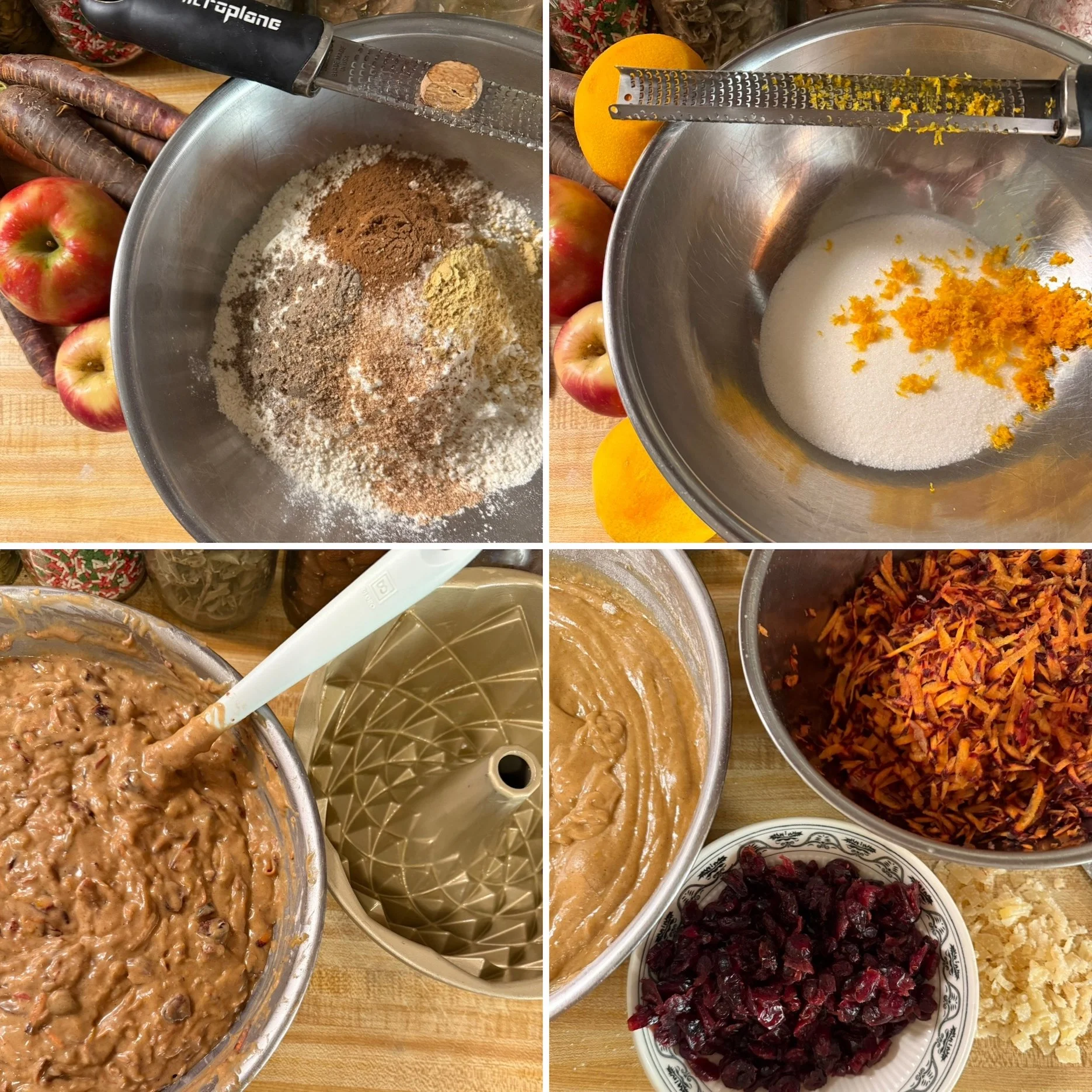 4) Drain the cranberries. Grate the carrots and apples. Fold all four additions into the hydrated batter. Spoon into your prepared Bundt pan and bake on the center rack for 50-55 minutes, testing for doneness with a wooden skewer.