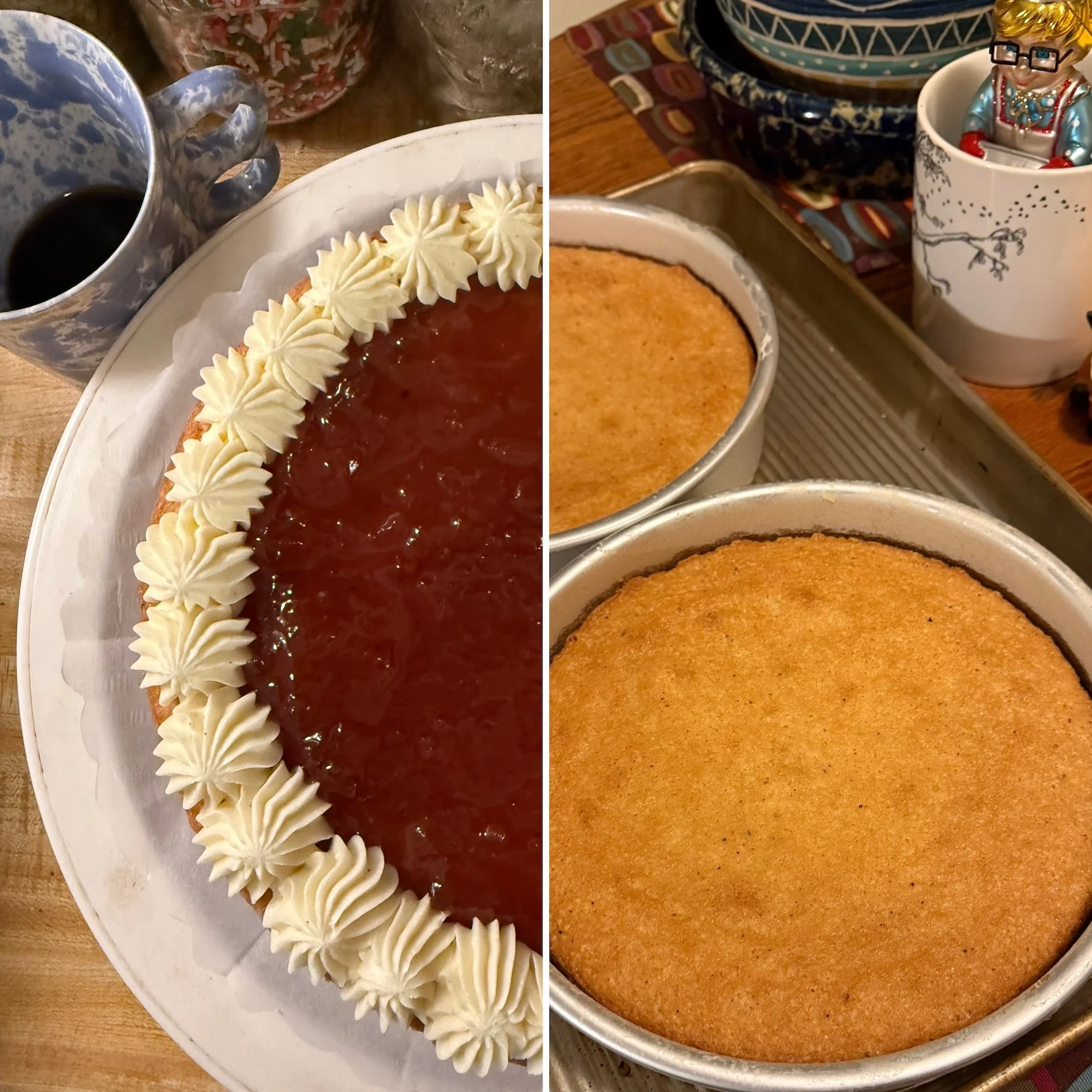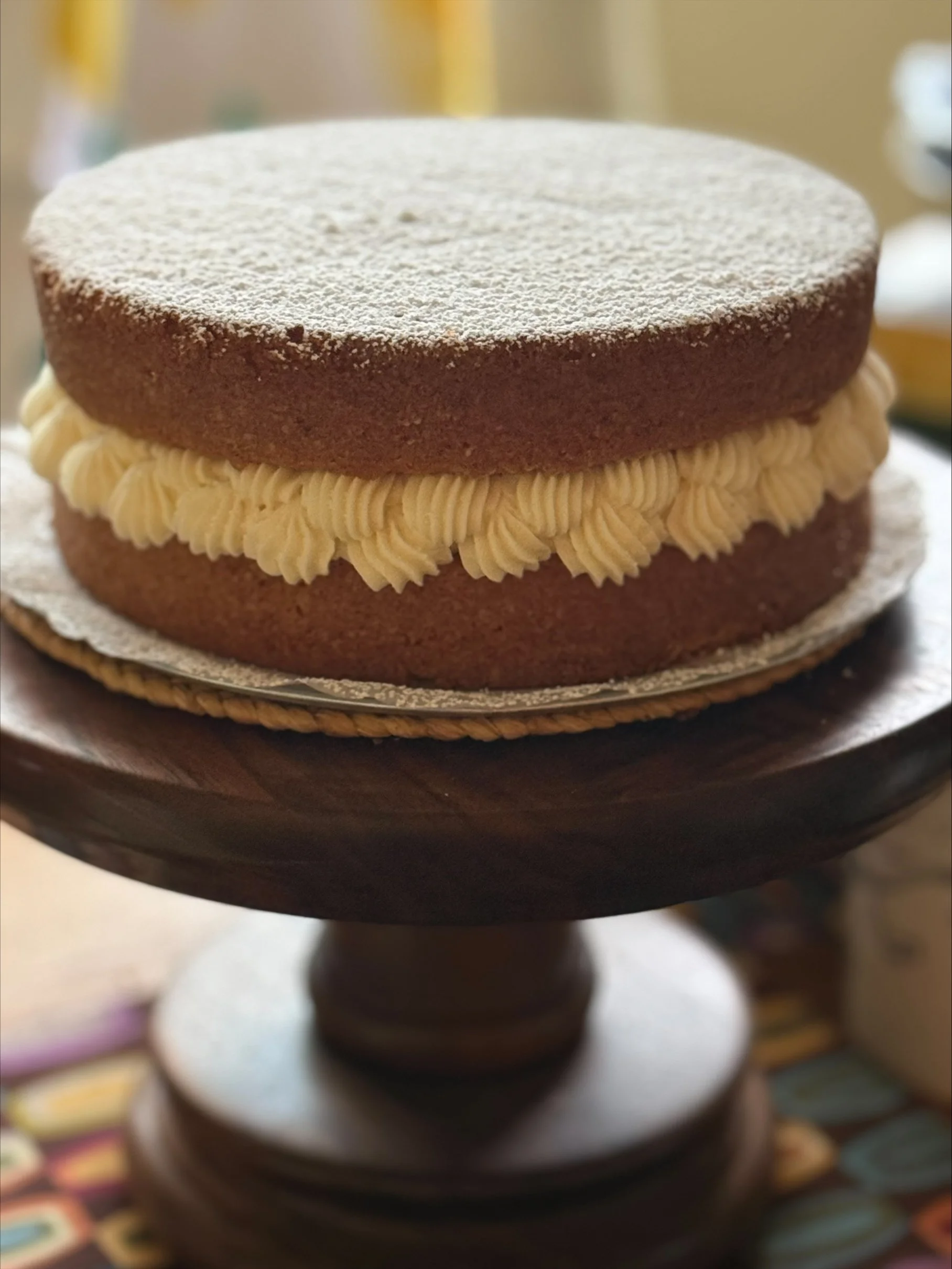 6) Place one cooled cake layer onto your presentation plate. Pipe a circle of buttercream at the edge of cake, creating a boundary for your chosen jam. Spread the jam onto the cake and then pipe a full layer of buttercream over the jam. Place the second later cake, flat side up, over the buttercream and lightly press down.