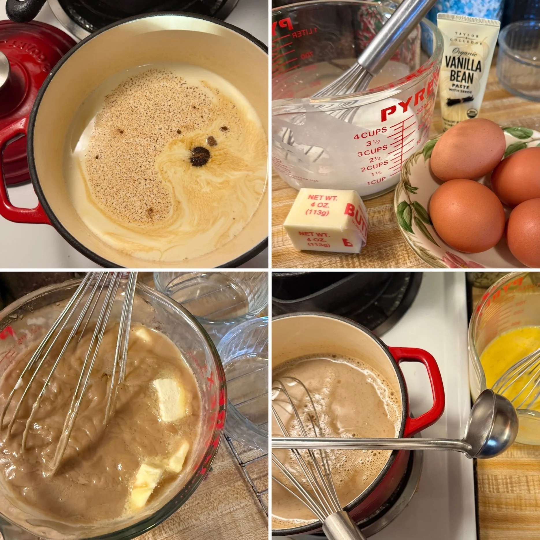 3) When the milk/sugar mix reaches a simmer, temper (very slowly add) ¼ of the mixture into the liaison, whisking constantly. Add this mixture back into the original saucepan and whisk constantly over medium-low heat until thickened. Strain the pudding into a glass bowl and whisk in the butter and vanilla paste.