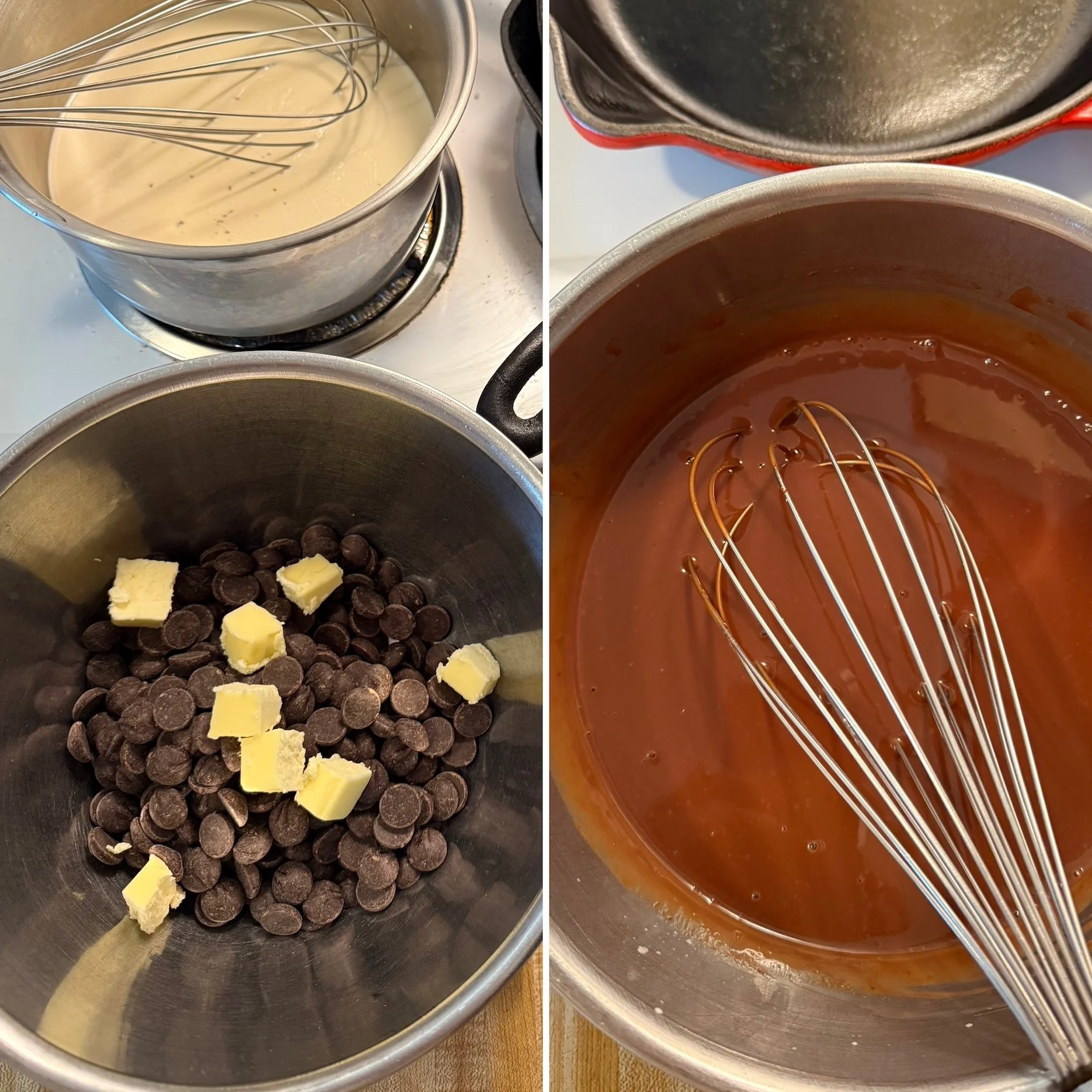 2) In a medium bowl, set over a bowl of simmering water, combine the dark chocolate, butter and hot water. Whisk occasionally as it melts. Once smooth, set aside to slightly cool.