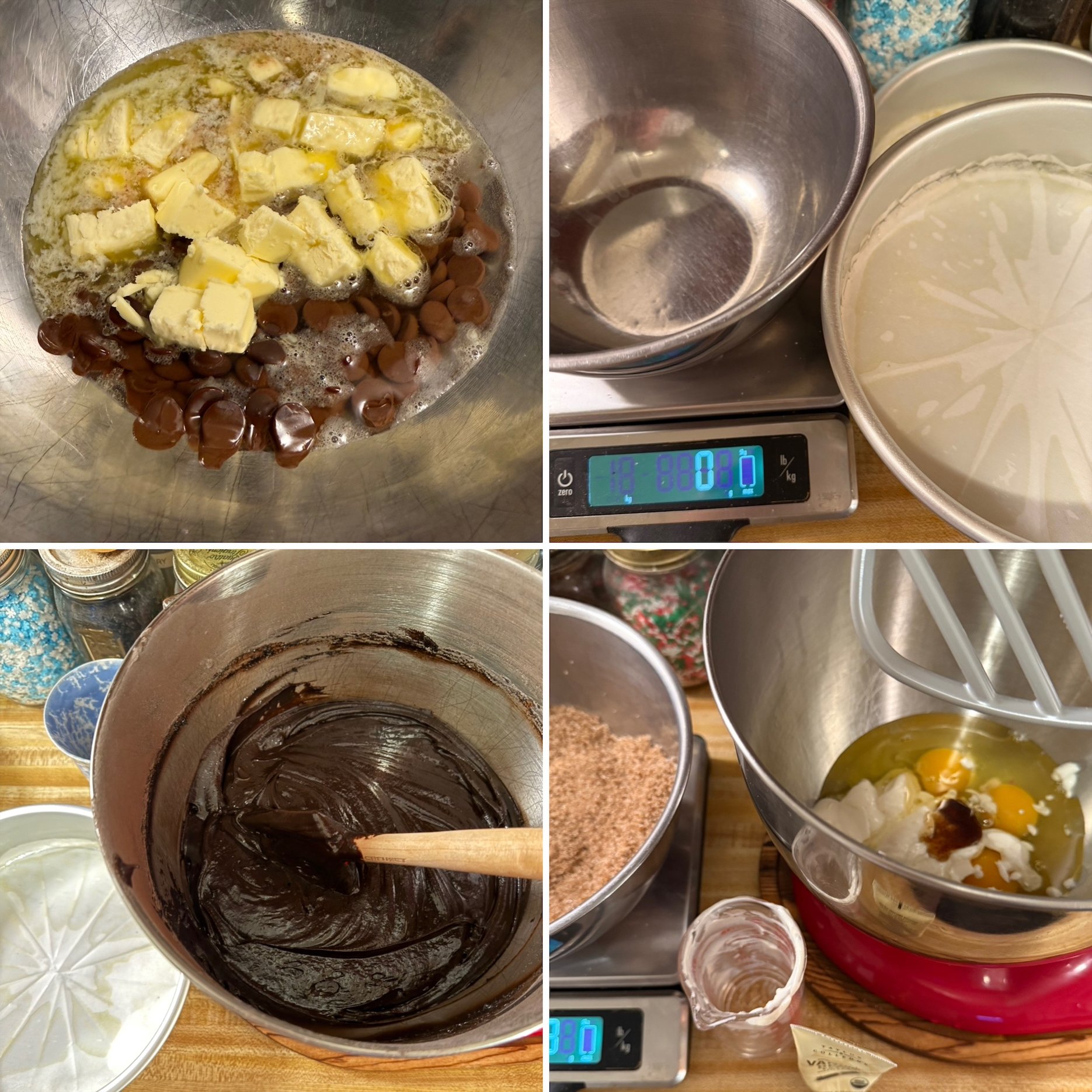 1) Prepare two 8” pans (butter and parchment paper) and preheat your oven to 350 degrees.