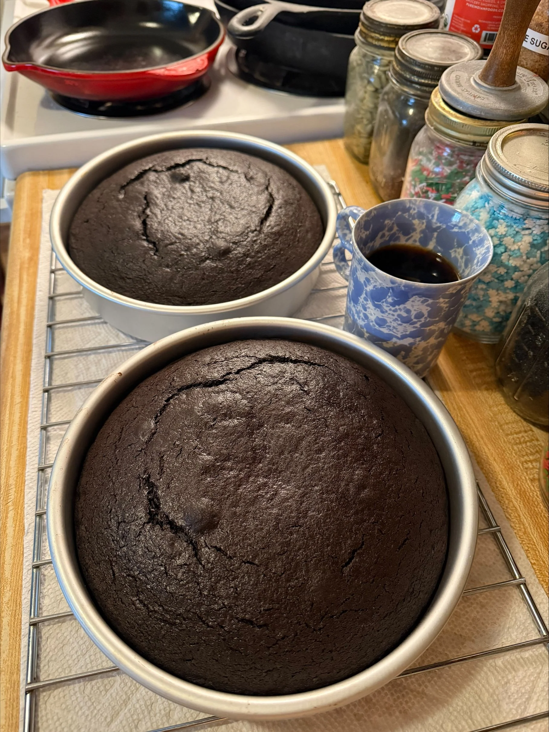 4) In the bowl of a standing mixer, combine the eggs, yoghurt, vegetable oil and vanilla. Mix on medium until fully combined. Add the two sugars and mix until smooth. Add the chocolate mixture and mix until smooth. Add the dry mixture and mix just until smooth. Divide the batter evenly between the two prepared pans and bake 35-40 minutes, just until a wooden skewer comes out clean. Set the cakes on a wire rack for 10 minutes and then tip them out of the pans to cool completely.