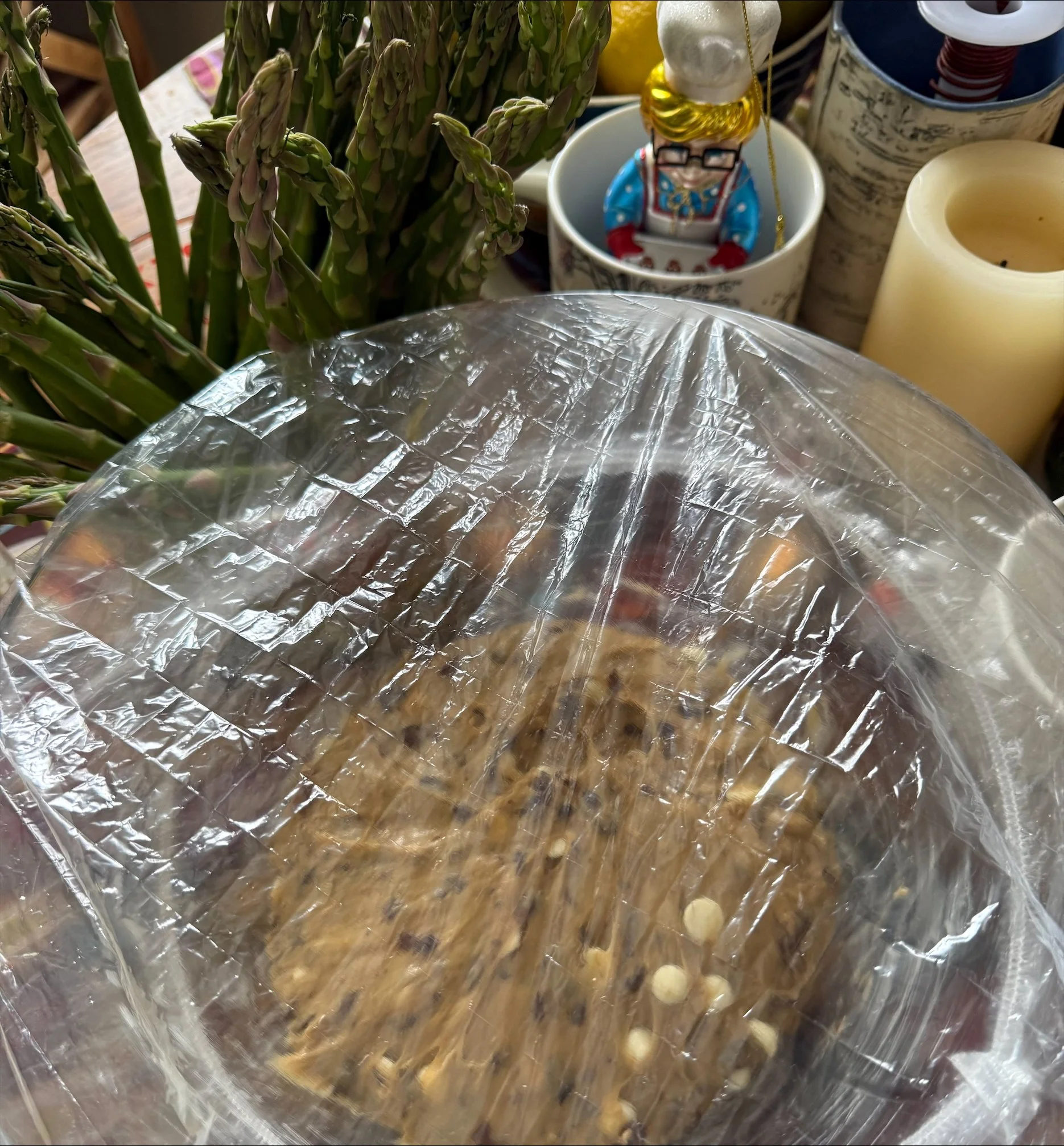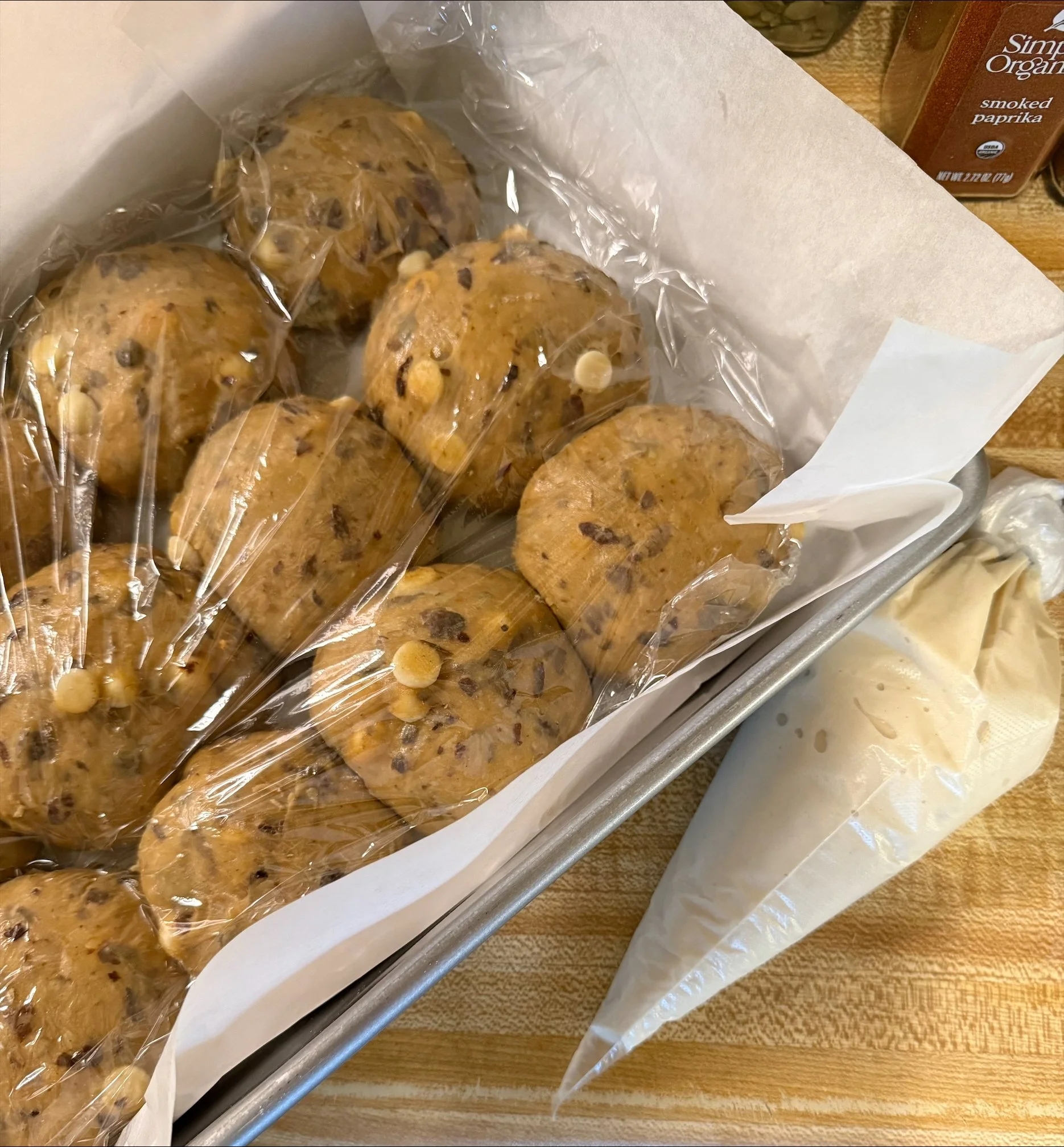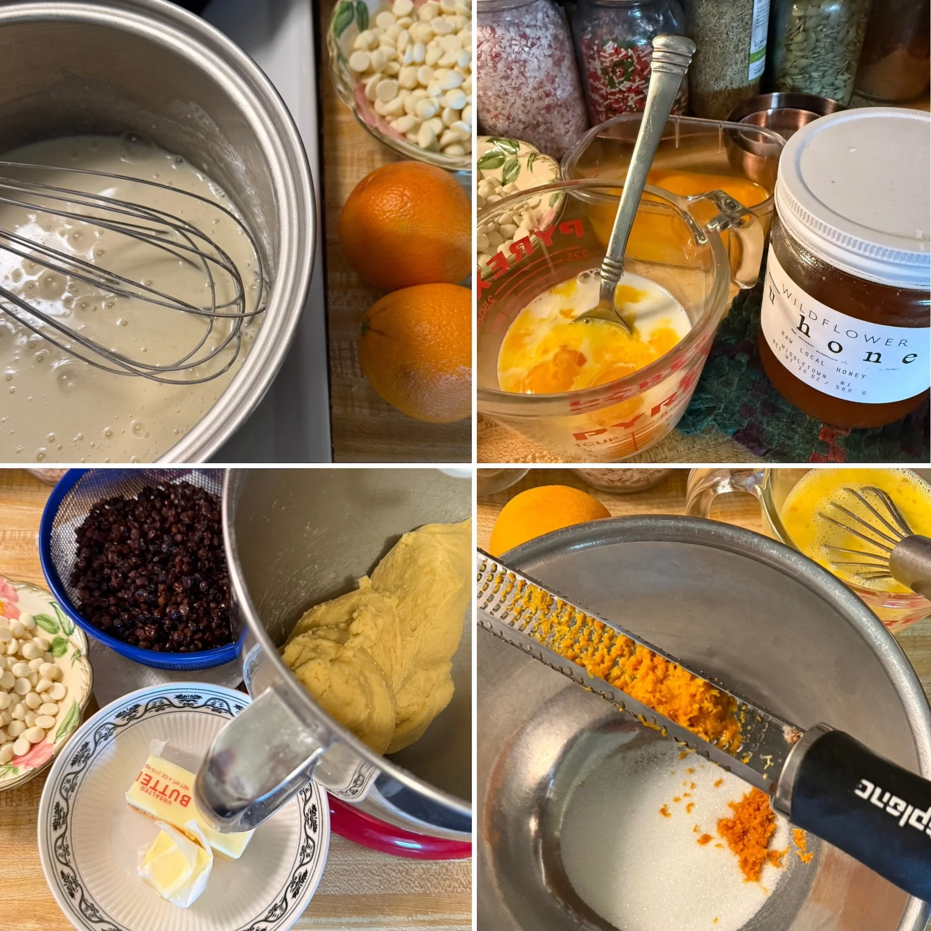 3) In a medium bowl, first whisk together the sugar and orange zest. Add the bread flour, yeast and salt and whisk again. Switch to the dough hook and add the dry to the wet. Mix on low until a smooth dough forms, 4-5 minutes. Slowly add the butter, one Tbsp at a time until completely incorporated. Fold in the drained currants and white chocolate. Scrape the dough into a greased bowl, cover with plastic and let rise 1 ½ hours.