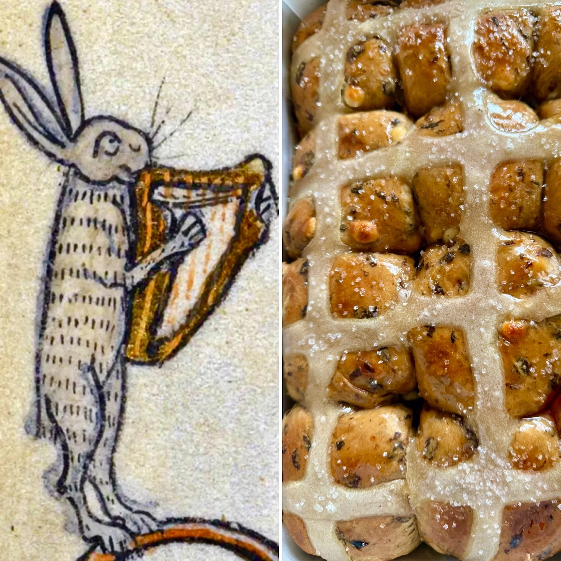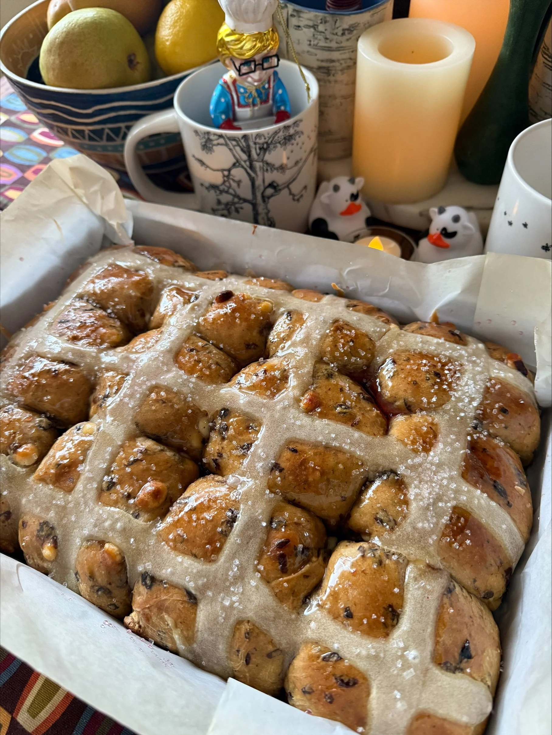 6) If you are creating a cross, whisk together ¾ cup all-purpose flour, 1 tsp granulated sugar and ½ cup water until smooth. Using a piping bag to create a cross over the proofed buns.