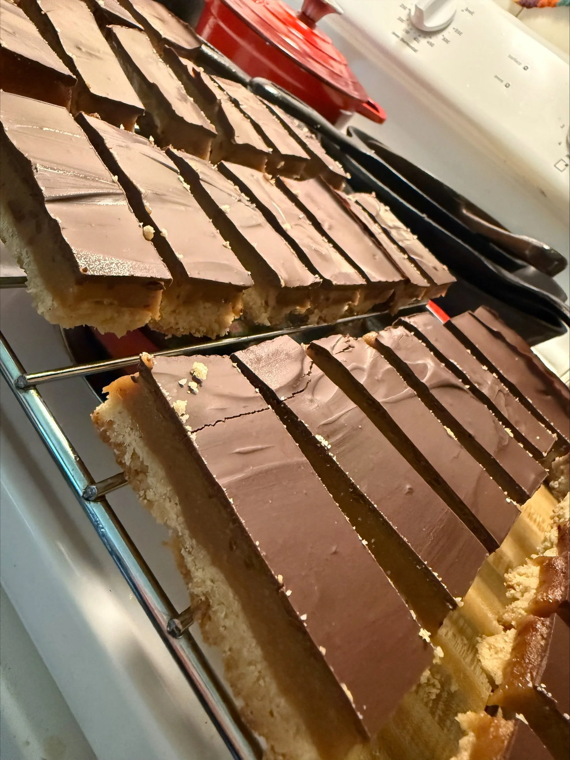 5) Remove the cookie from the pan using the foil sling. Use a heated knife to cut into four 3 ¼” rectangles. Cut each rectangle into 8 equal pieces.