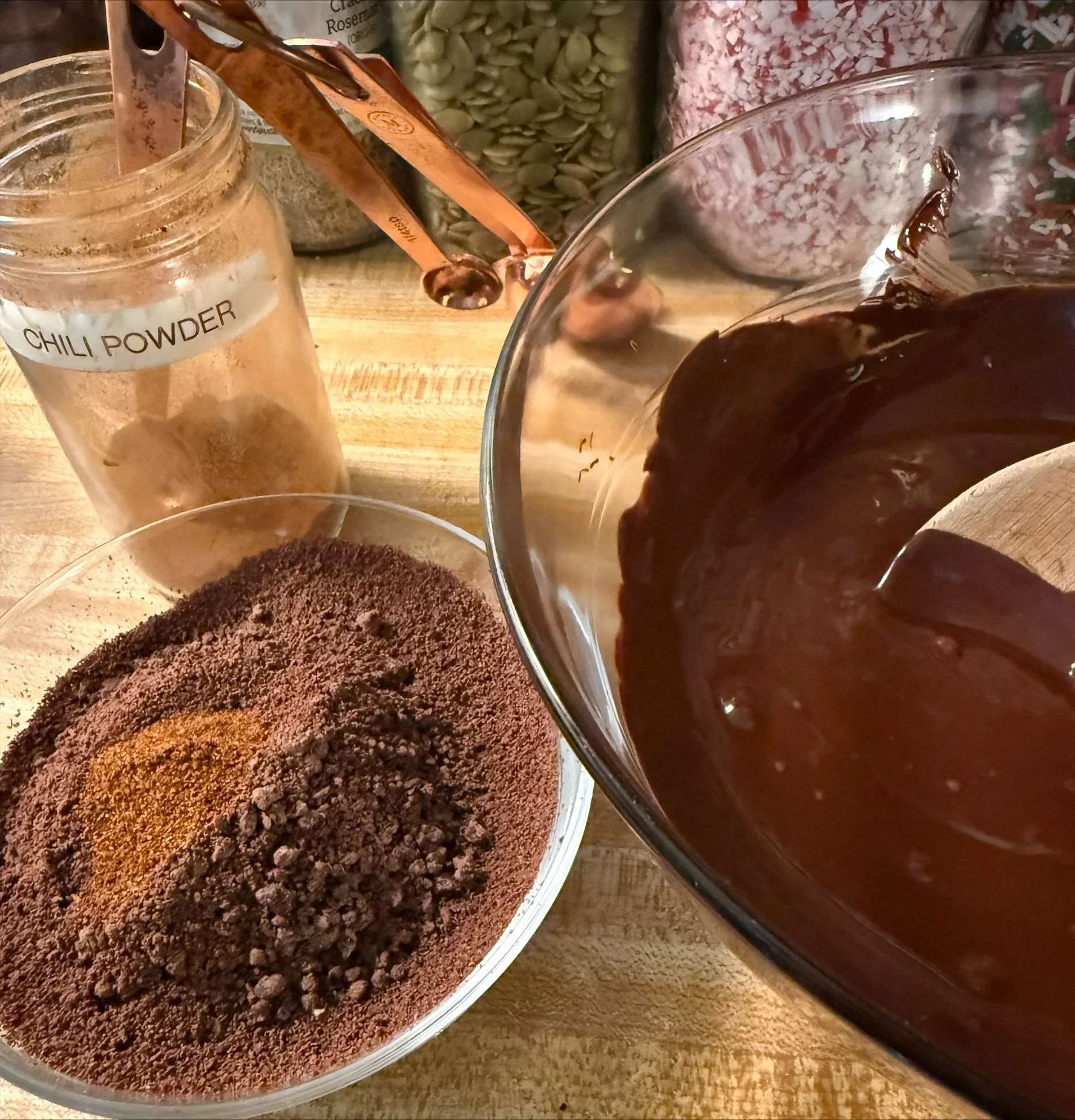 4) For the chocolate: Melt 6 ounces of the chocolate in a double burner, or microwave on 50%, stirring every 15 seconds, until melted and smooth. Add the grated chocolate and chili powder and whisk until smooth. Pour over the filling evenly and then chill until the chocolate is just set, about 10 minutes.