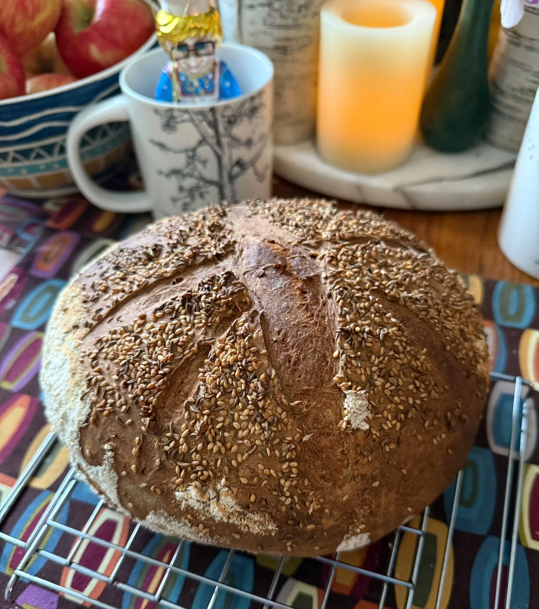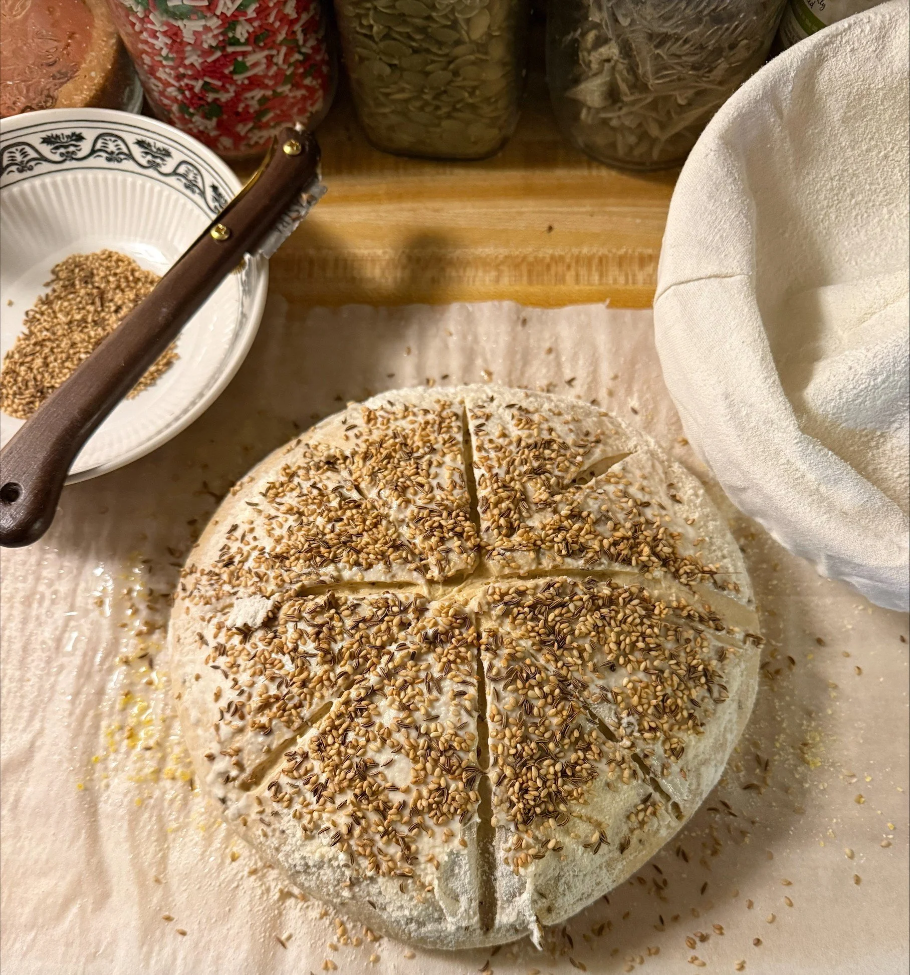 5) After 45 minutes of preheating and 2nd rise, place your baking sheet in the oven to also preheat. Cut a 12” square of parchment paper and dust lightly with cornmeal. Carefully turn the dough onto the parchment paper. Dust off any excess flour. Stir together the 2 Tbsp sesame seeds and the remaining 1 Tbsp caraway seeds. Spray the dough with water and sprinkle seeds all over the dough. Score the dough with a razor. Carefully remove the heated sheet pan from the oven and slide the parchment paper and dough onto the pan. Place in the oven and bake for 45-50 minutes until the loaf is a deep golden brown and sounds hollow to the touch.